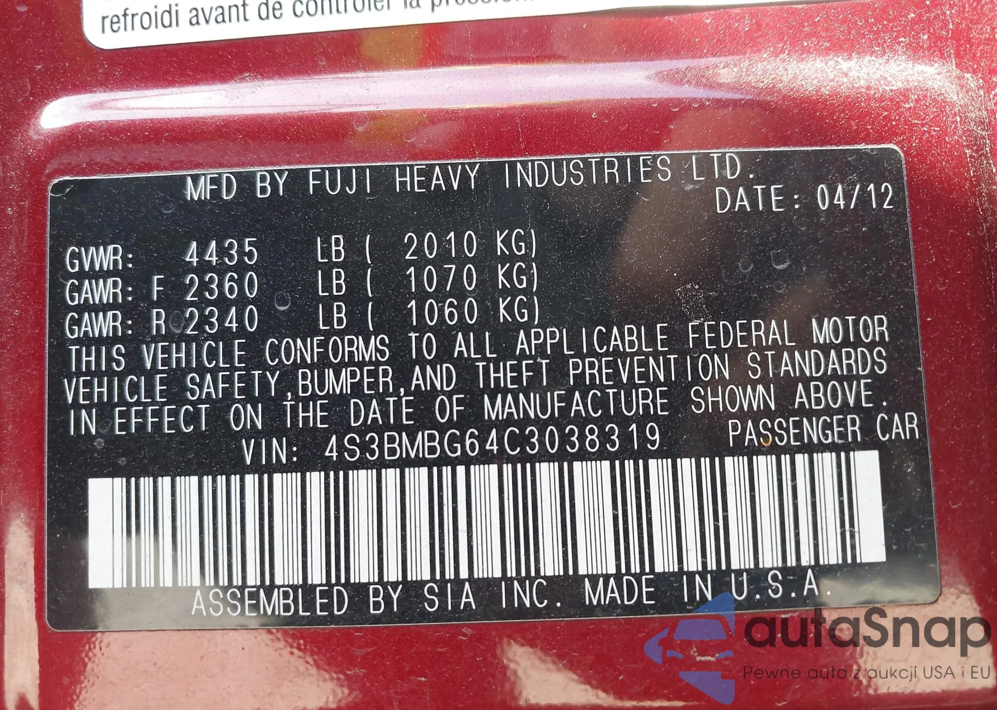 LOT: 43206246 VIN: 4S3BMBG64C3038319