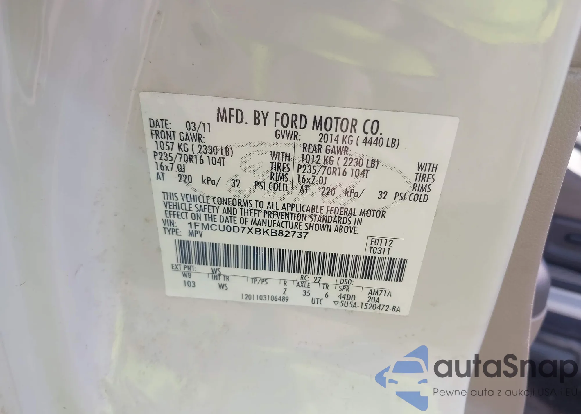 • VIN 1FMCU0D7XBKB82737