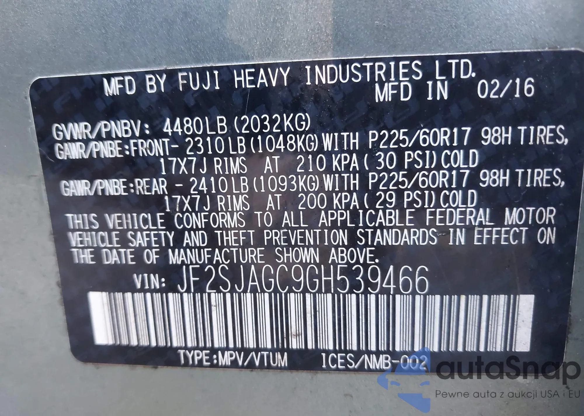 • VIN JF2SJAGC9GH539466