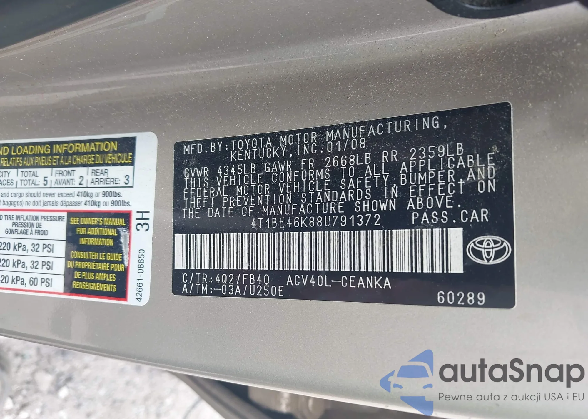 LOT: 43235462 VIN: 4T1BE46K88U791372