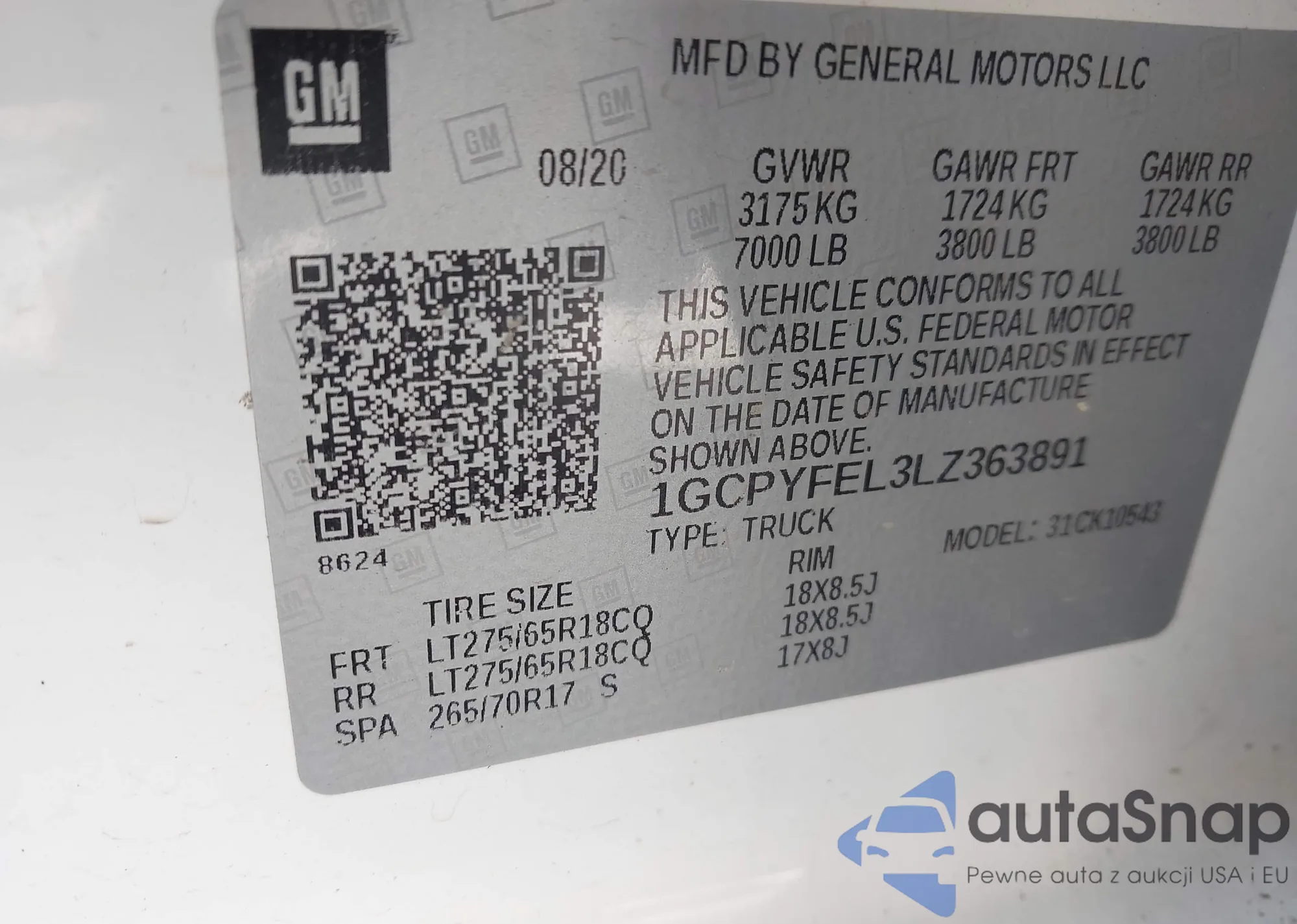 LOT: 42834310 VIN: 1GCPYFEL3LZ363891