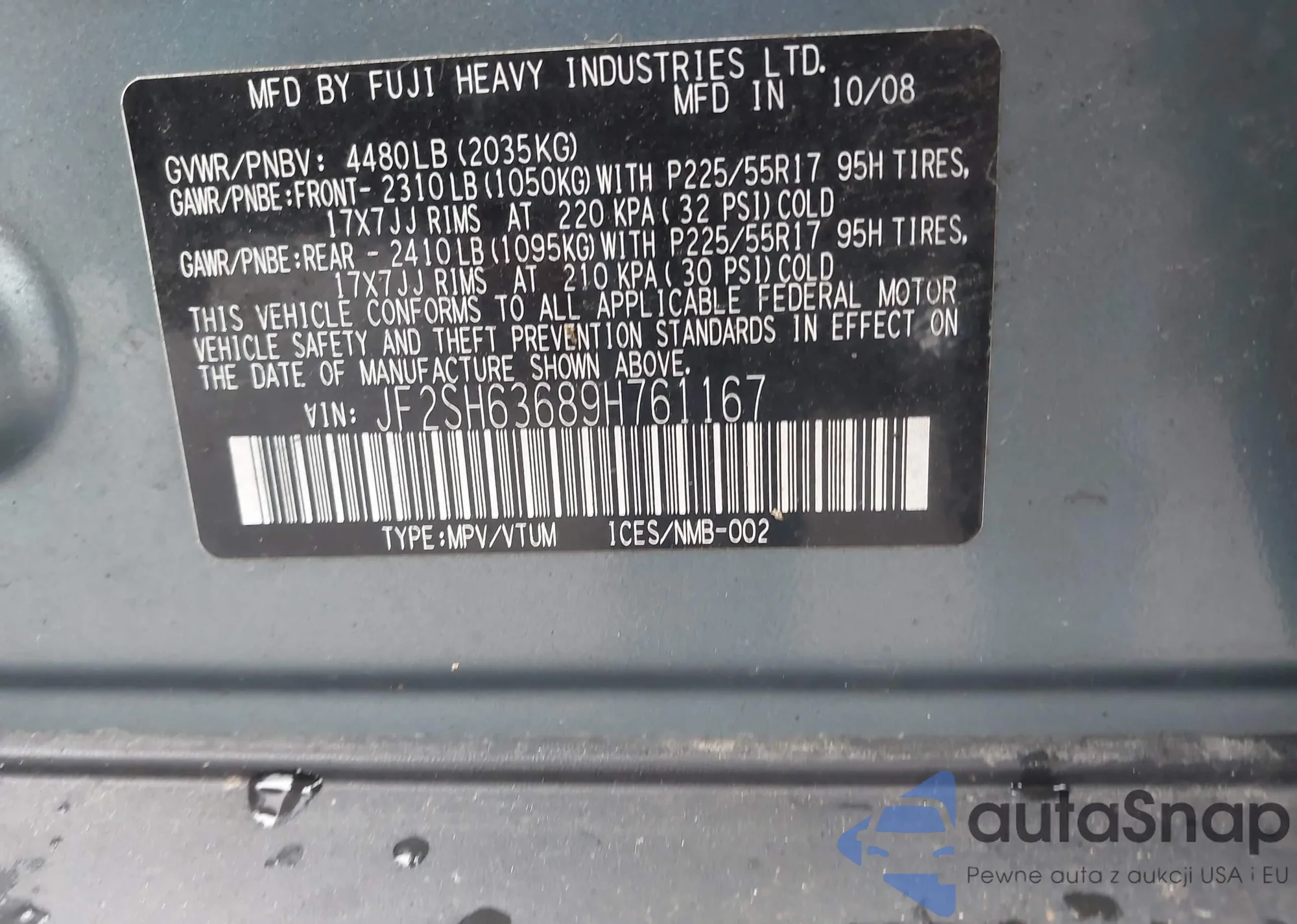 • VIN JF2SH63689H761167