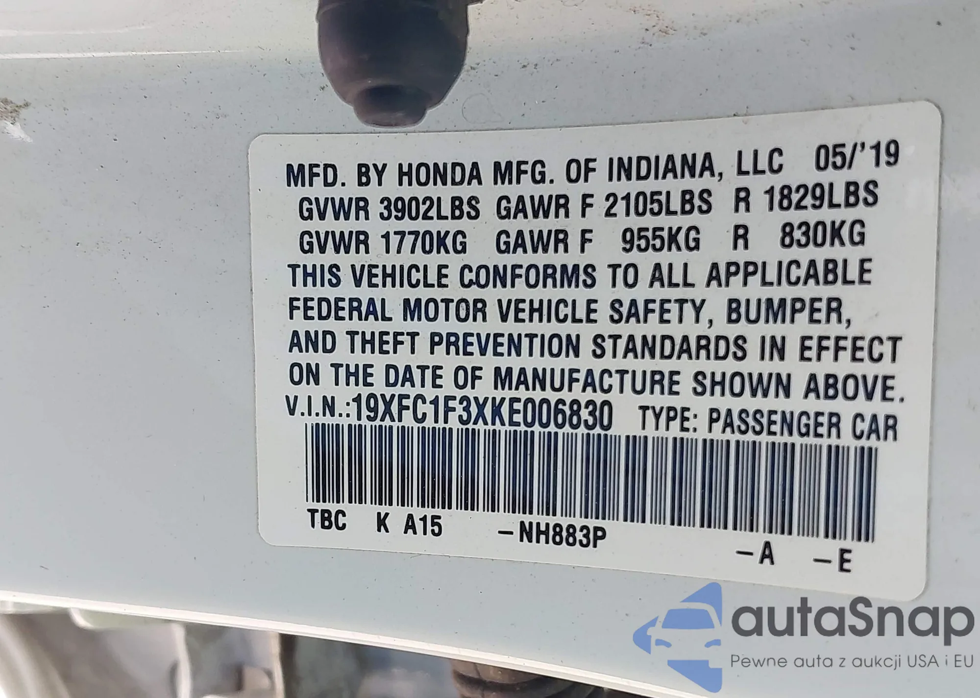 • VIN 19XFC1F3XKE006830