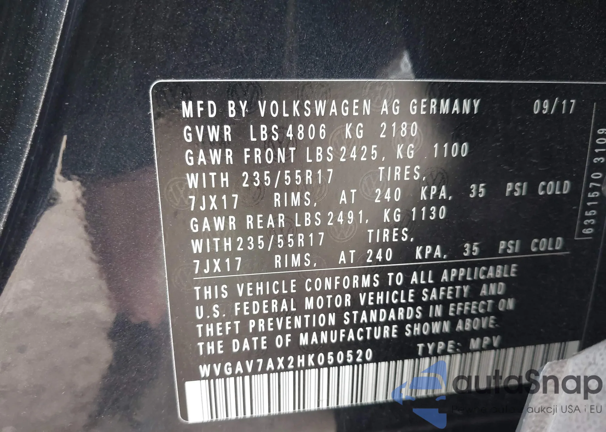 • VIN WVGAV7AX2HK050520