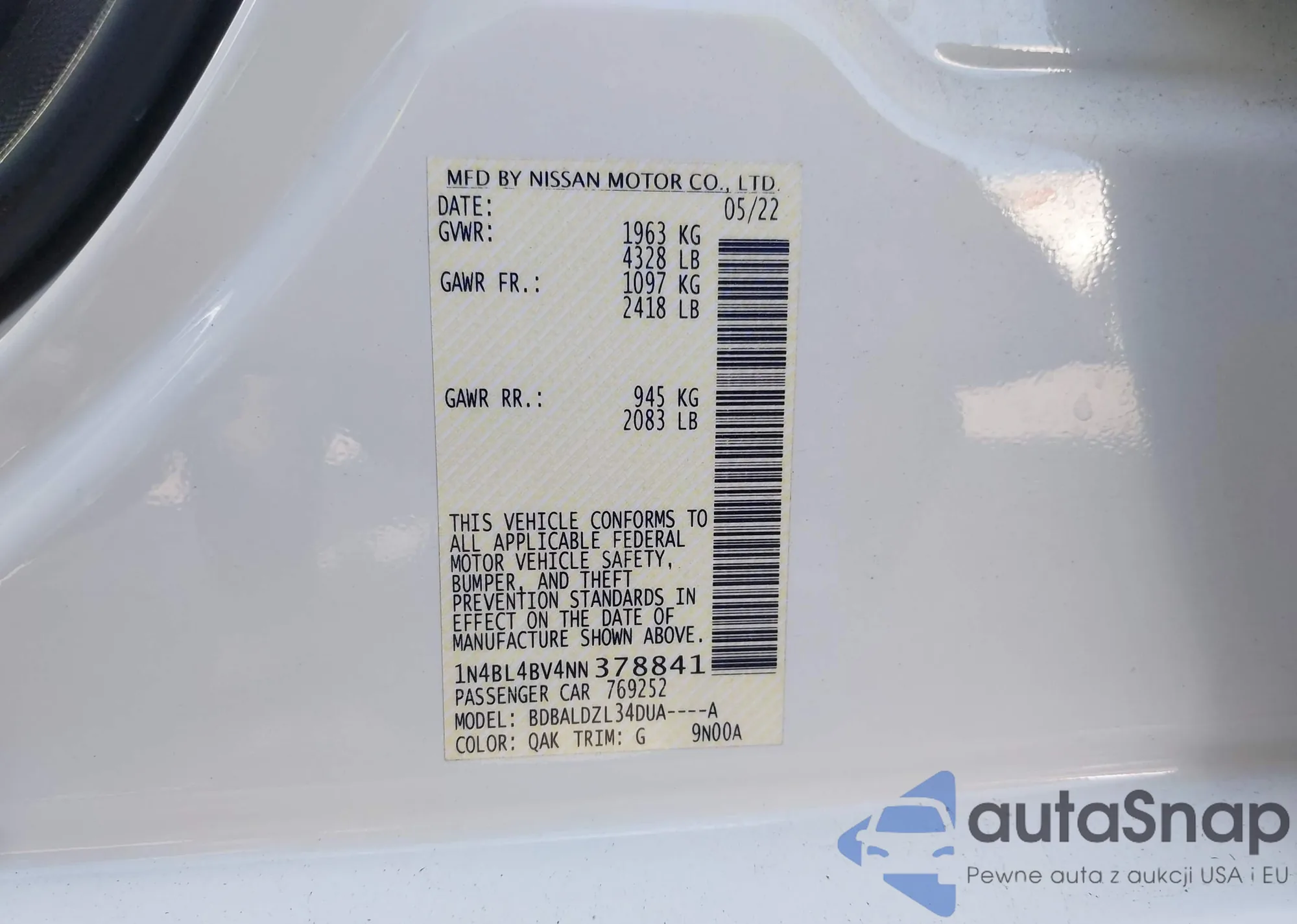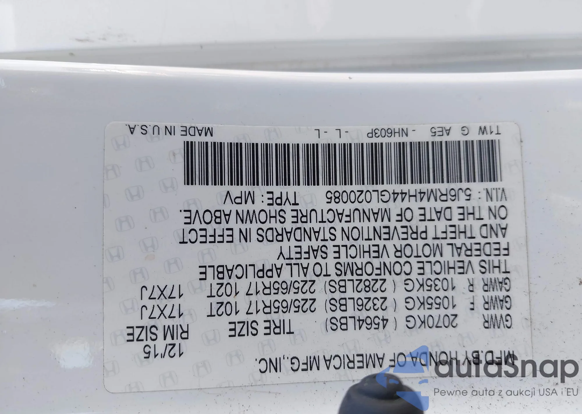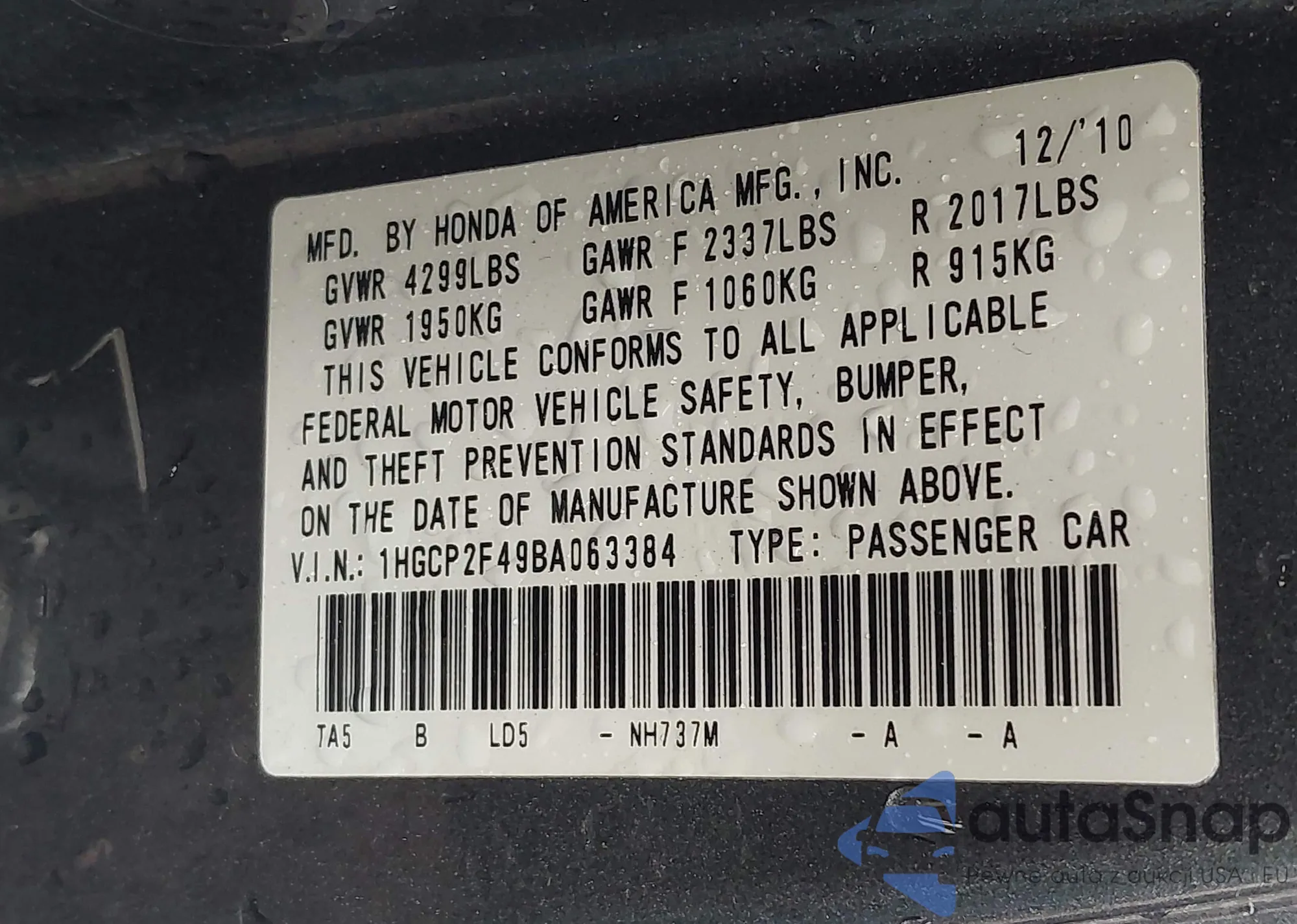 LOT: 43135875 VIN: 1HGCP2F37AA179835