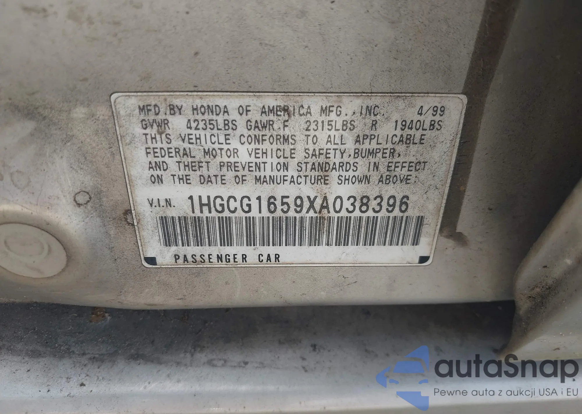 LOT: 43285456 VIN: 1HGCG1659XA038396