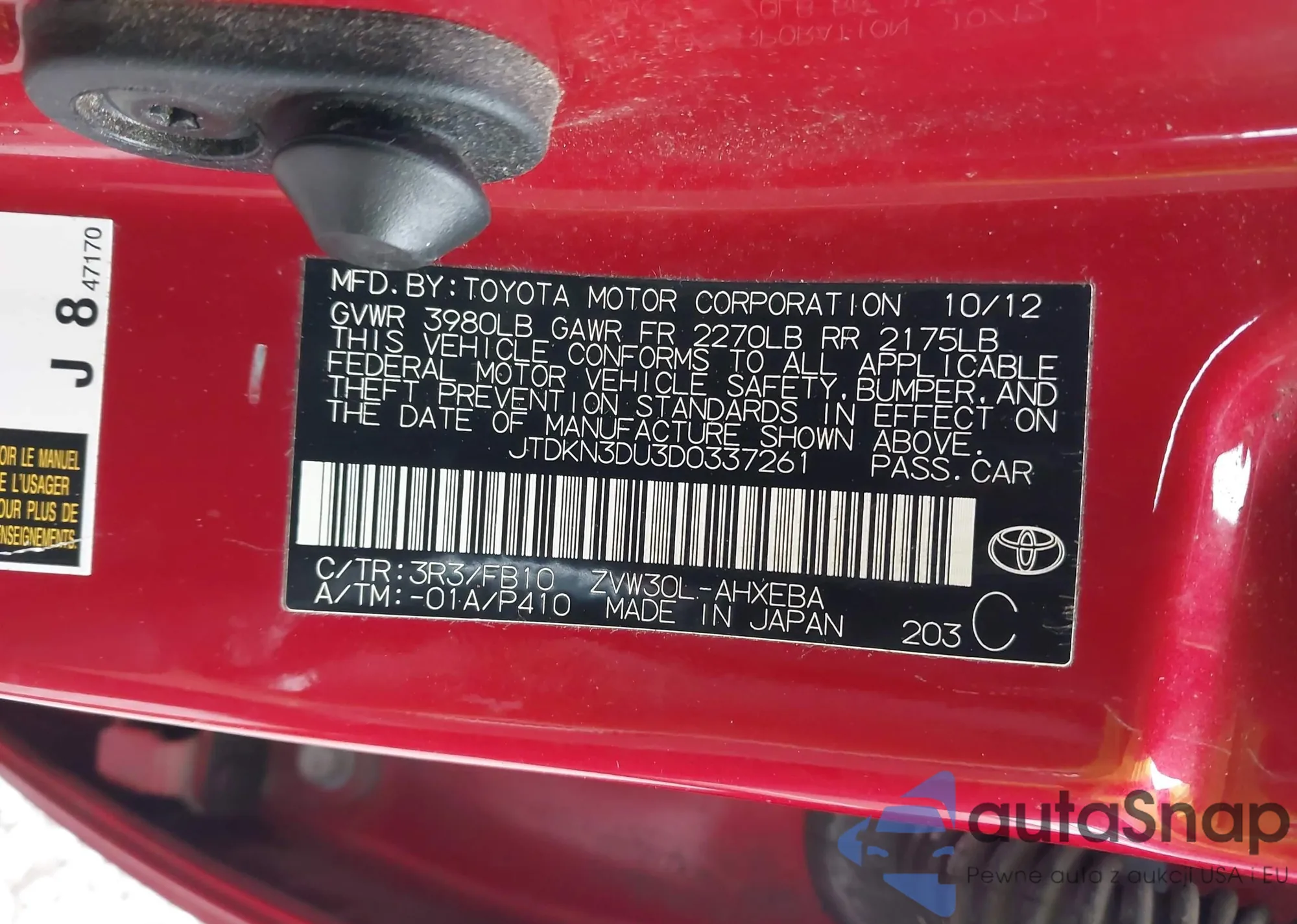 LOT: 43035361 VIN: JTDKN3DU3D0337261