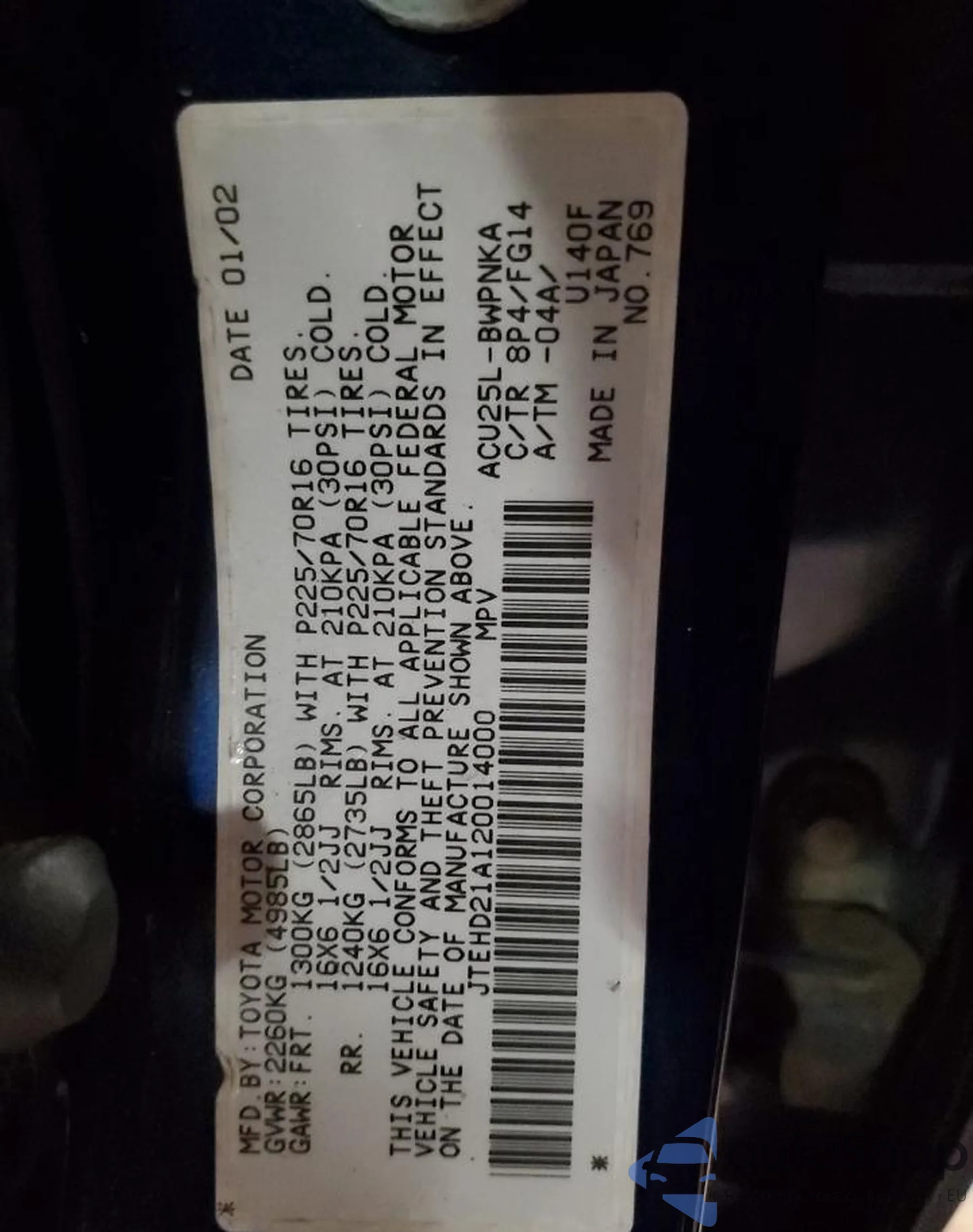 • VIN JTEHD21A120014000