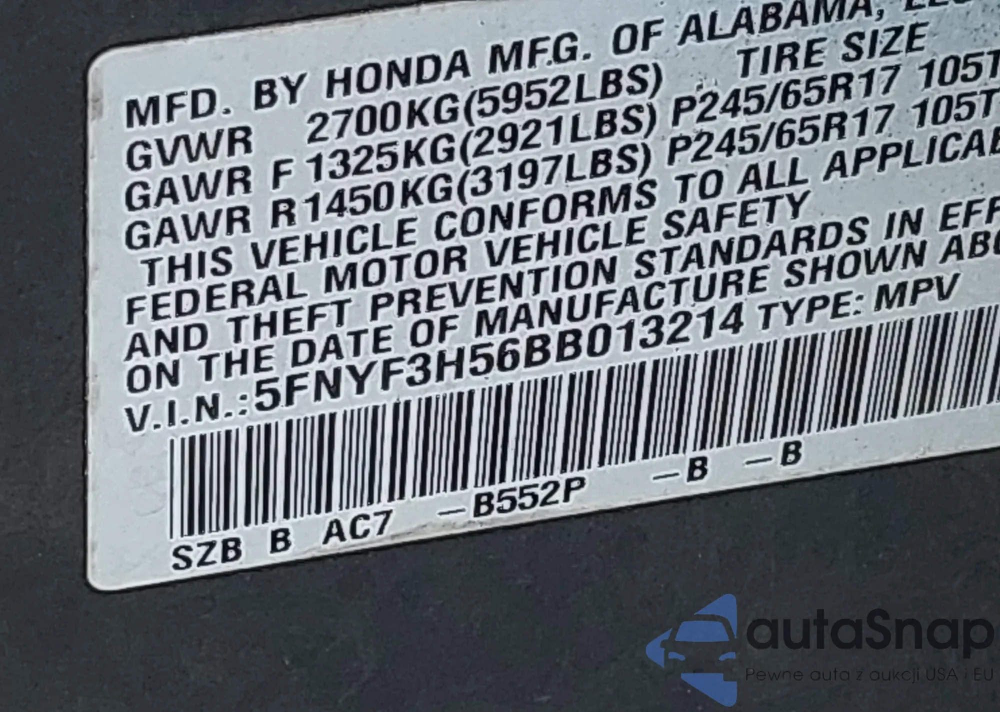 • VIN 5FNYF3H56BB013214