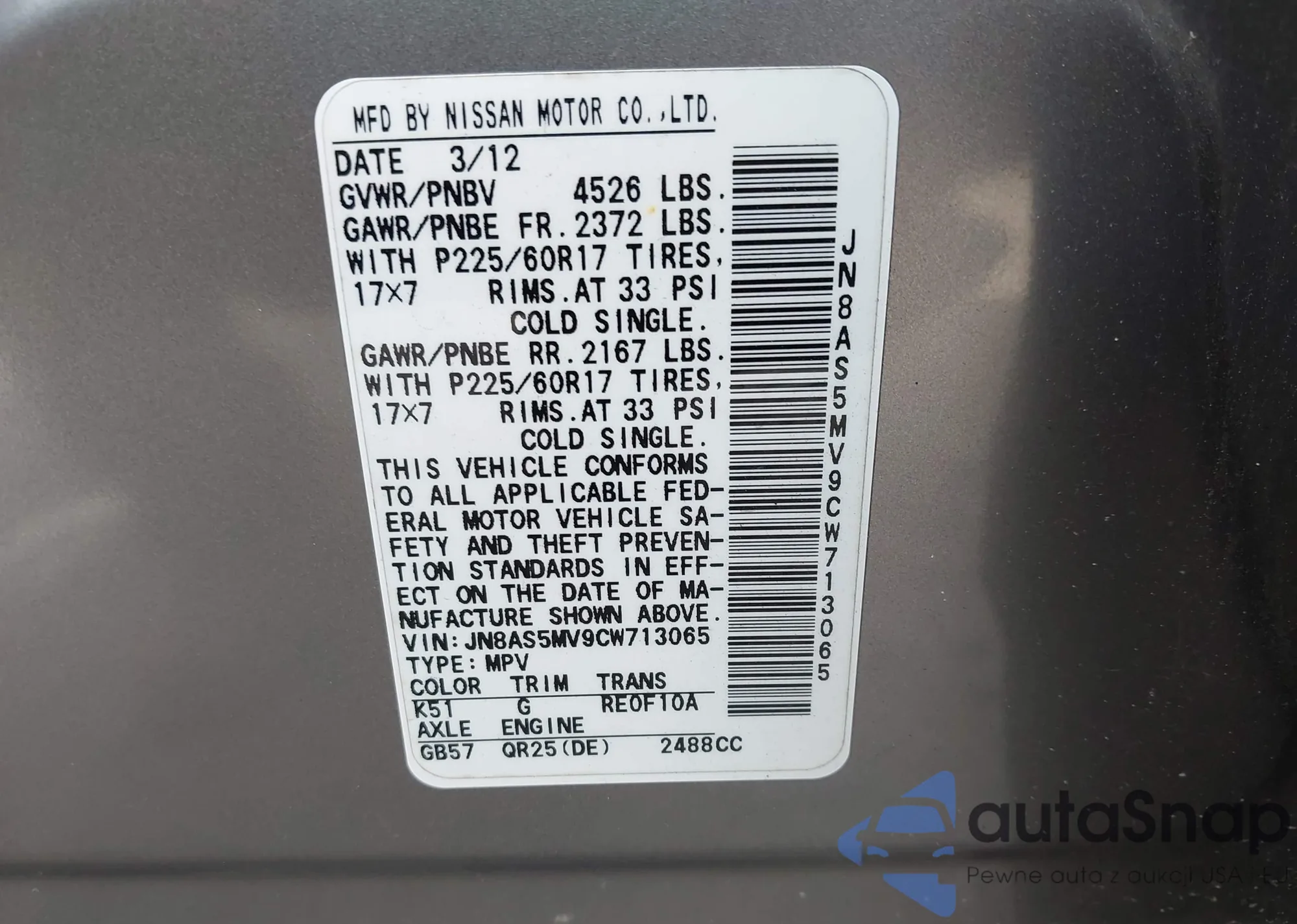 LOT: 43313416 VIN: JN8AS5MV9CW713065