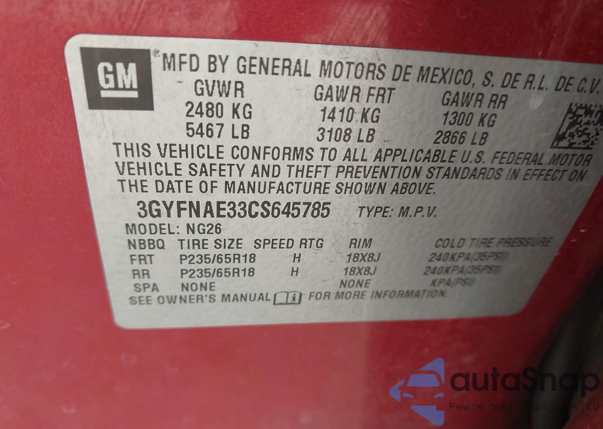 LOT: 43134586 VIN: 3GYFNAE33CS645785