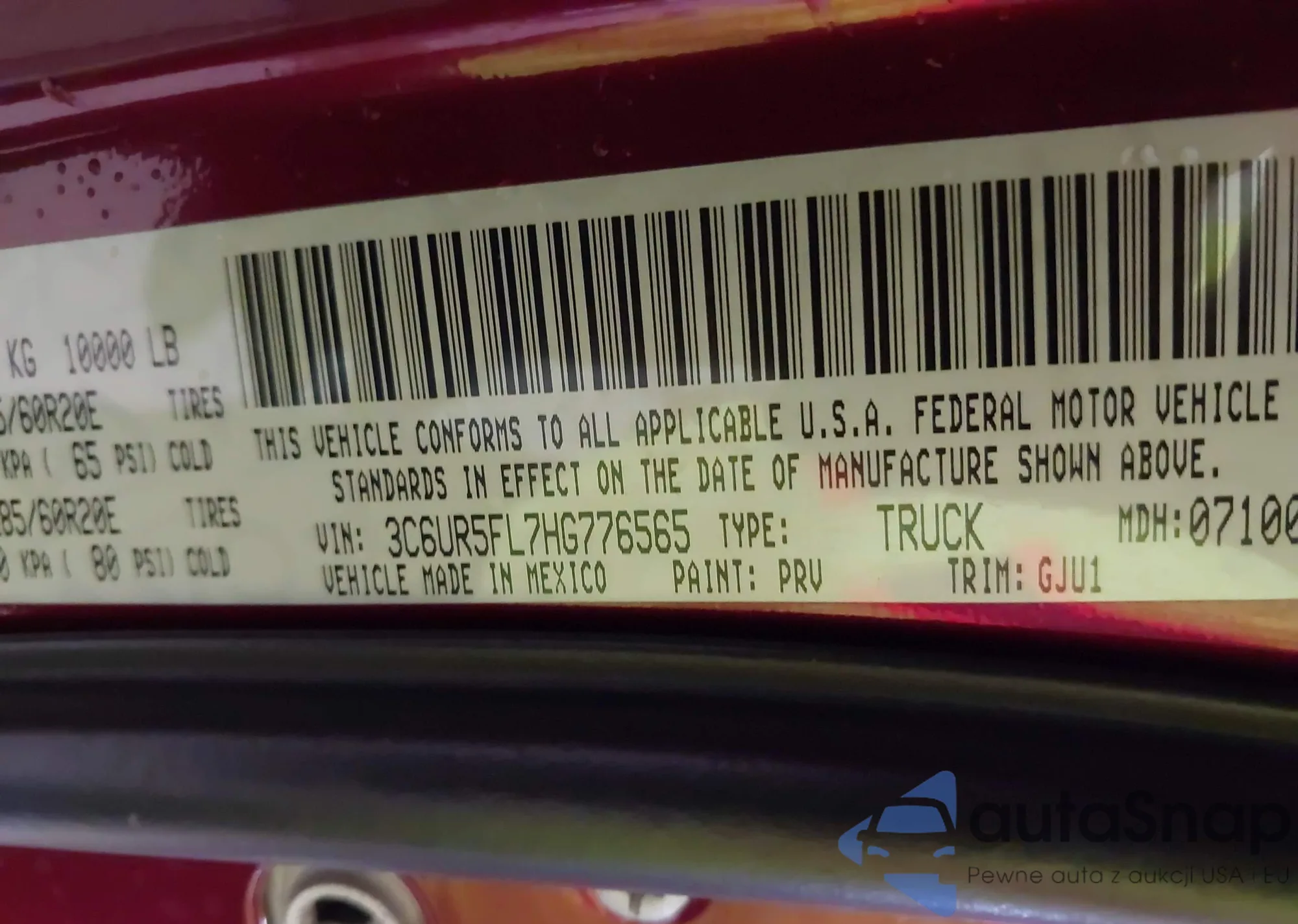 • VIN 3C6UR5FL7HG776565