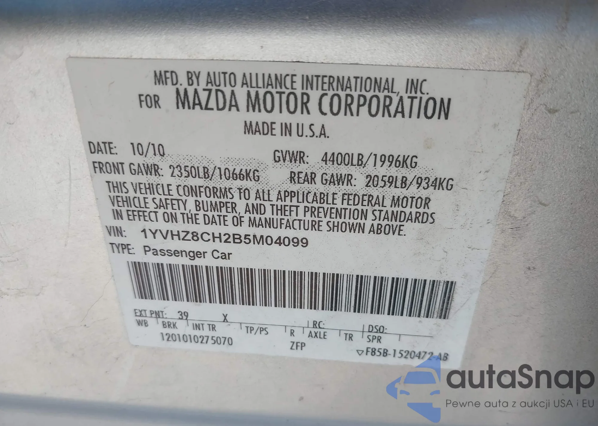 • VIN 1YVHZ8CH2B5M04099