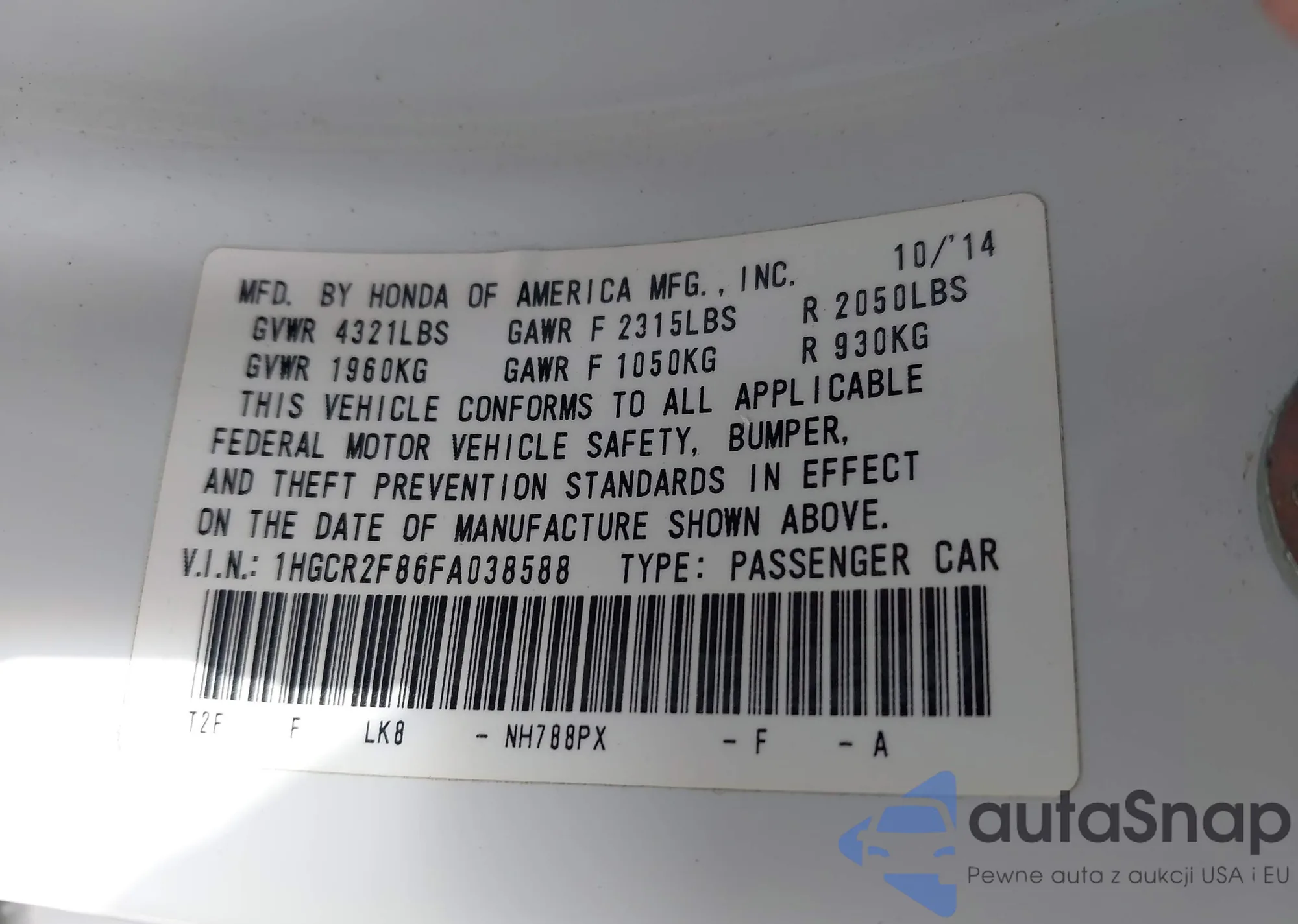 • VIN 1HGCR2F86FA038588