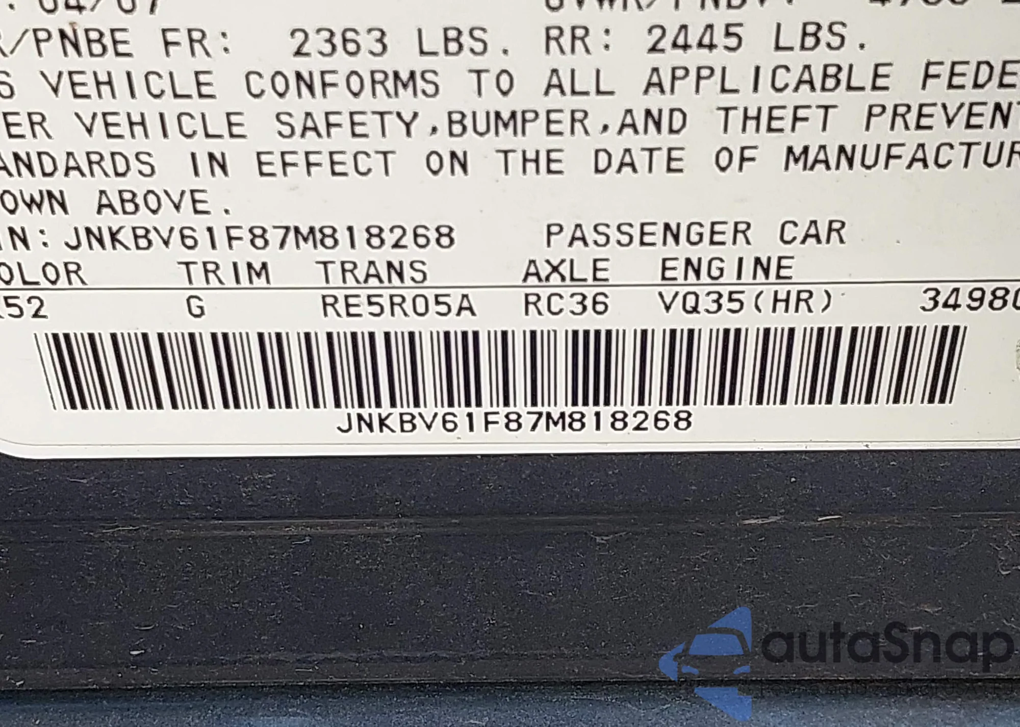 LOT: 43106560 VIN: JNKBV61F87M818268