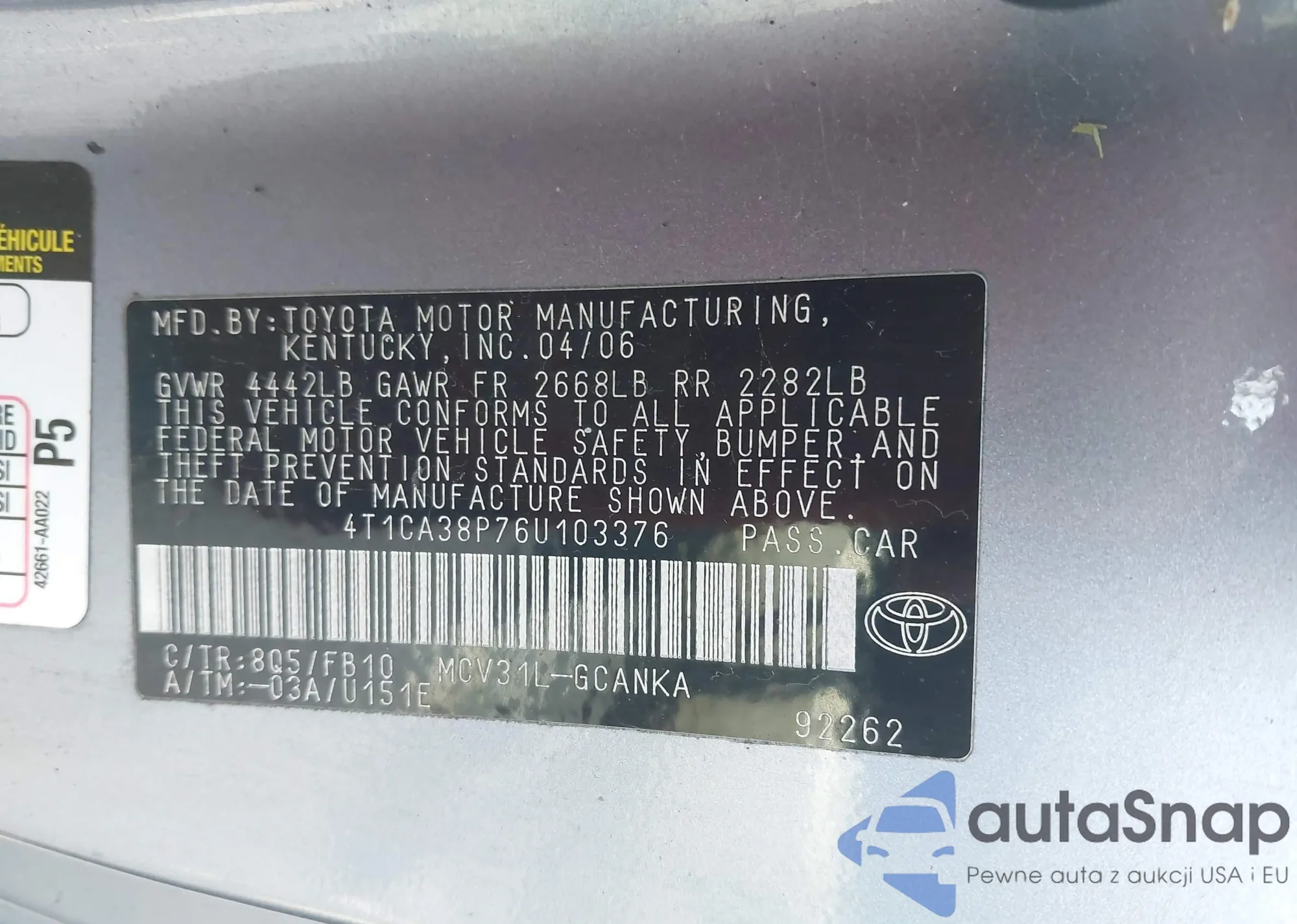 • VIN 4T1CA38P76U103376