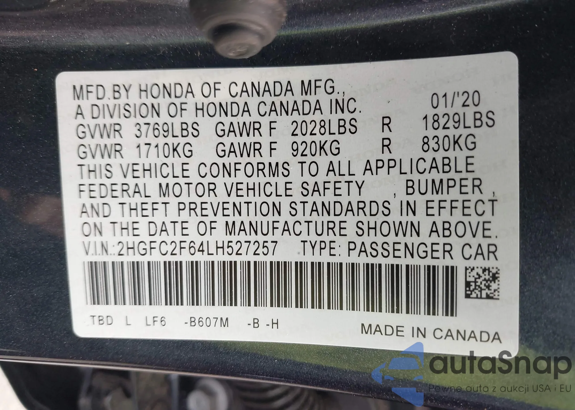 • VIN 2HGFC2F64LH527257