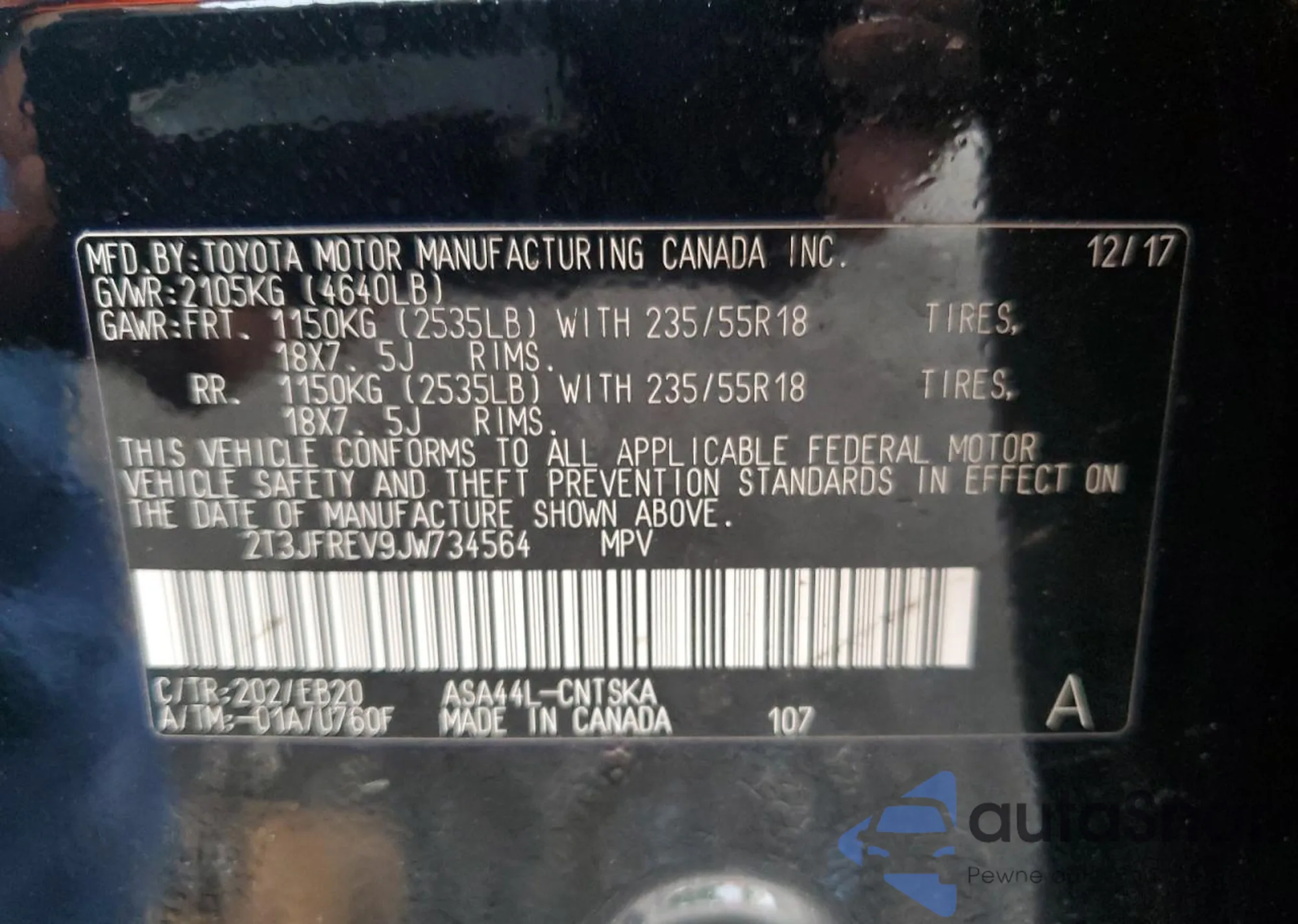 LOT: 69114545 VIN: 2T3JFREV9JW734564