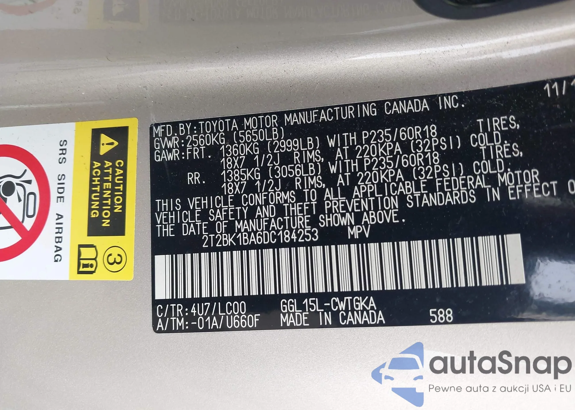• VIN 2T2BK1BA6DC184253