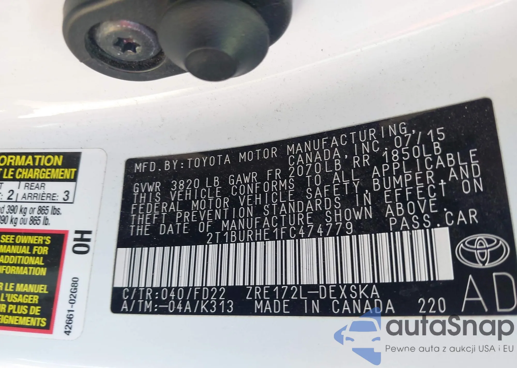 LOT: 43153482 VIN: 2T1BURHE1FC474779