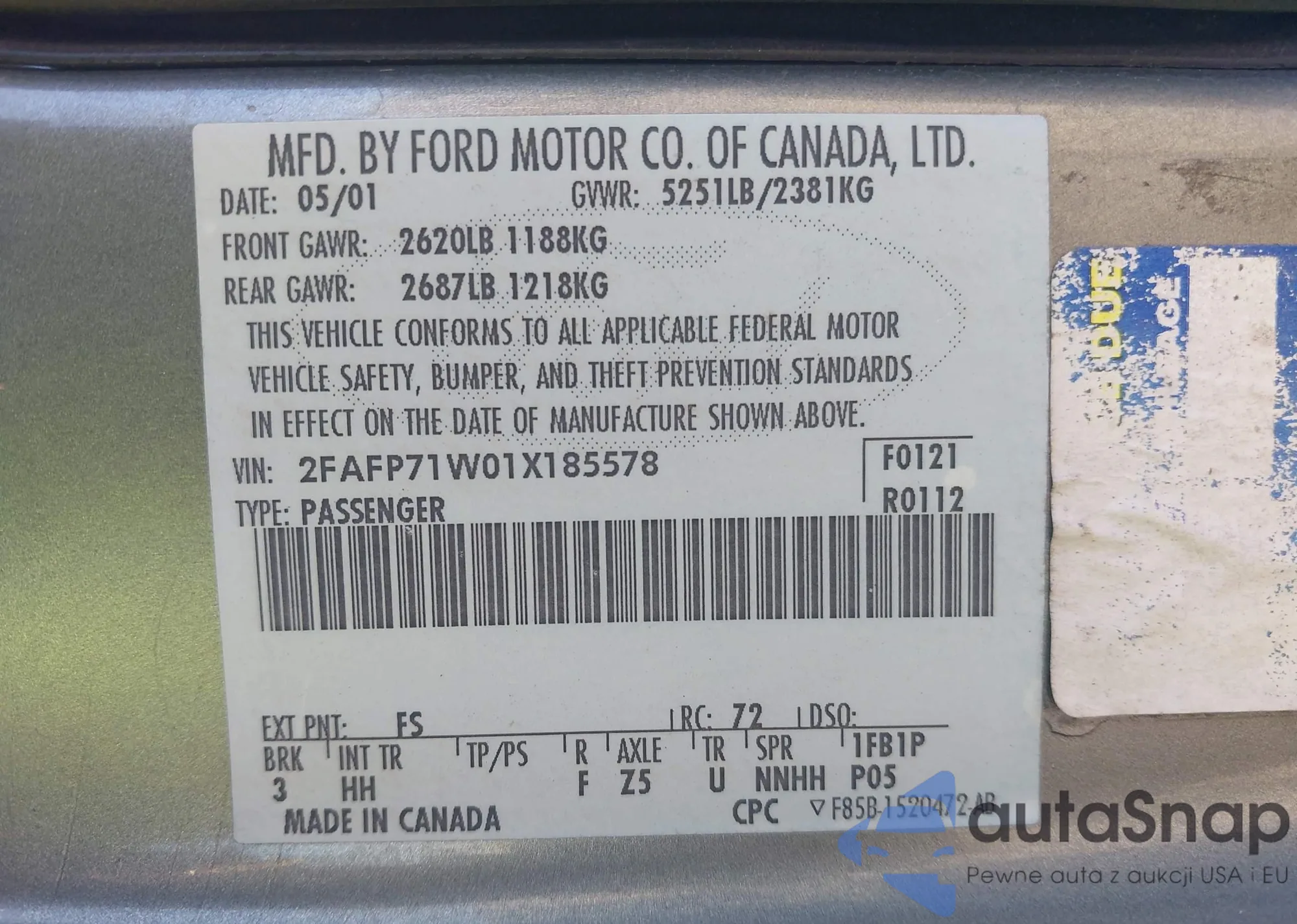• VIN 2FAFP71W01X185578