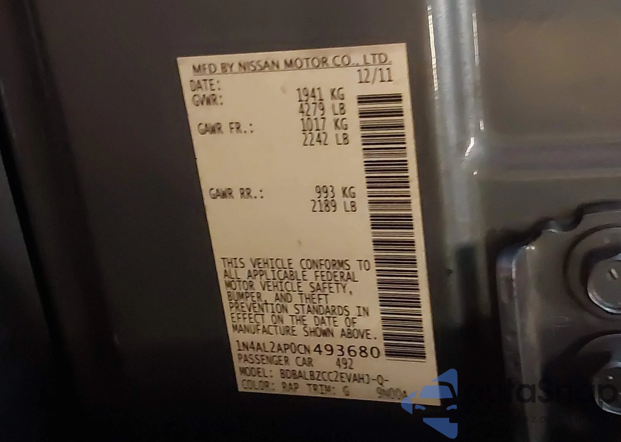 LOT: 43033438 VIN: 1N4AL2AP0CN493680