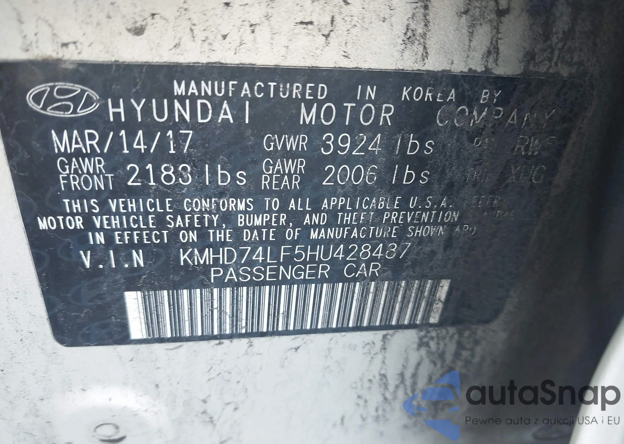 LOT: 43231710 VIN: KMHD74LF5HU428487