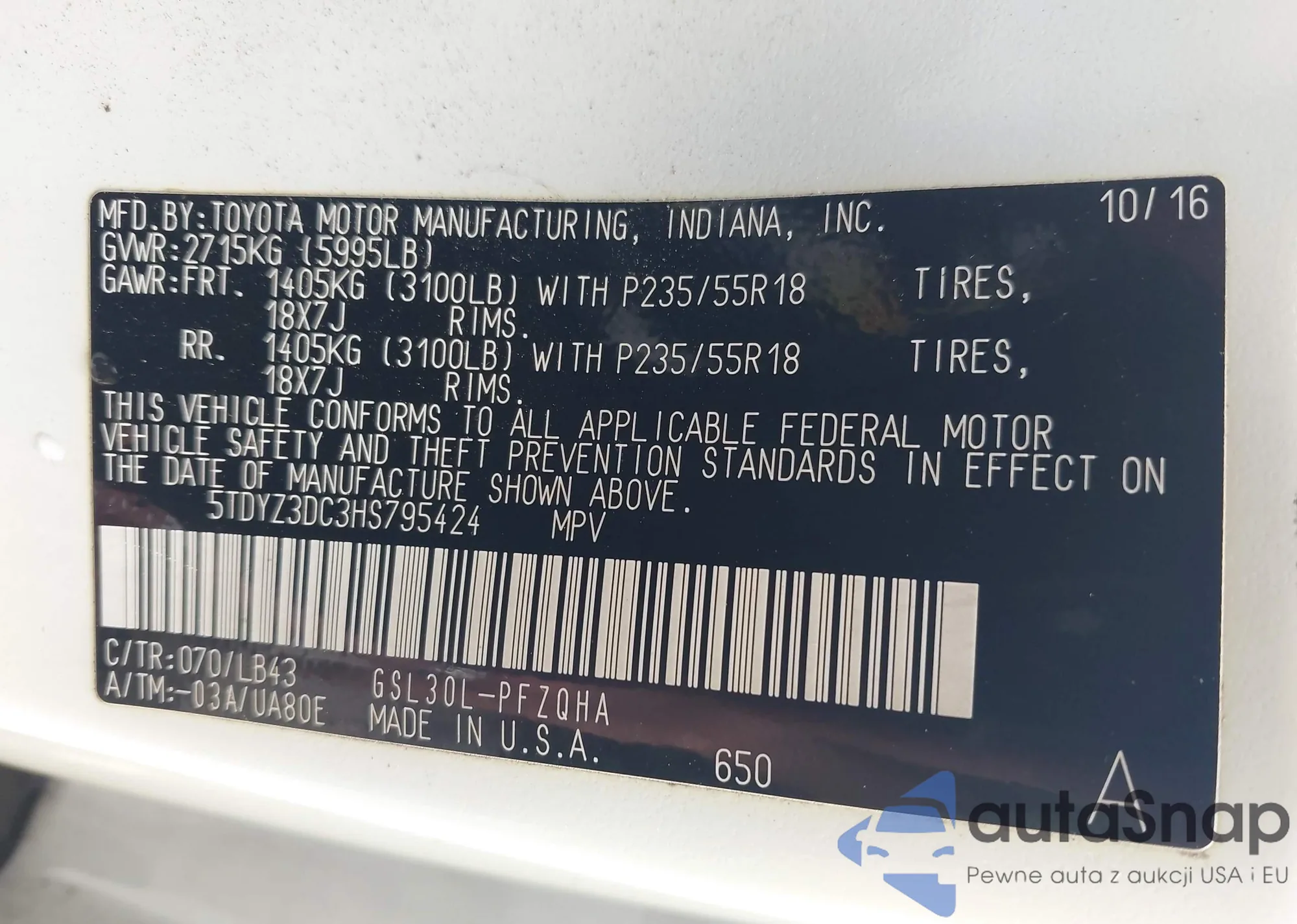 • VIN 5TDYZ3DC3HS795424
