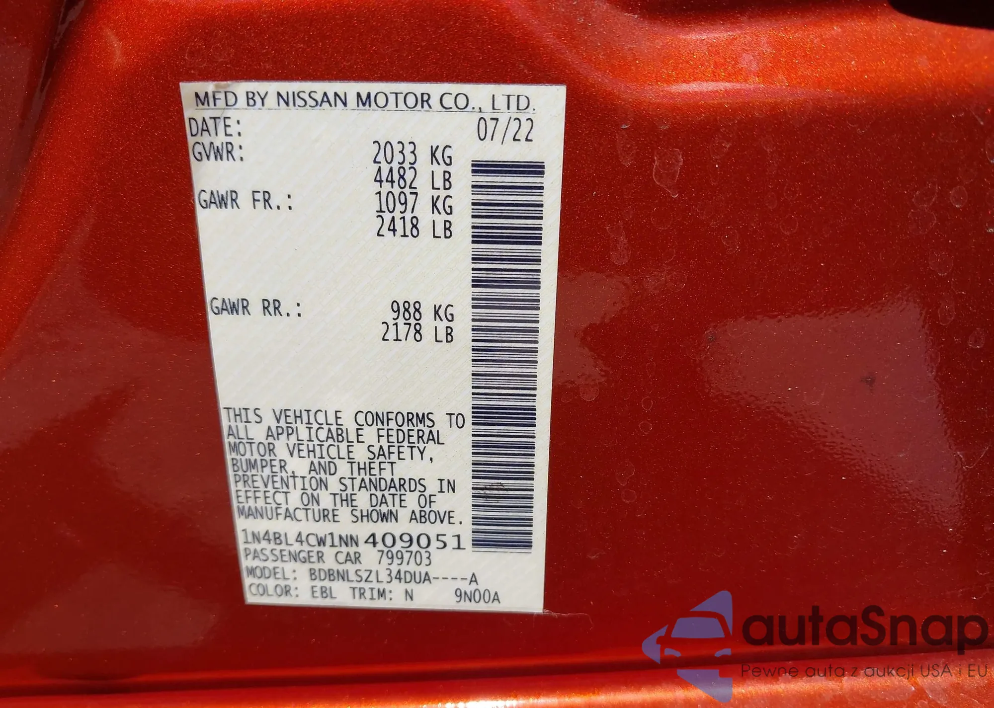 LOT: 42844205 VIN: 1N4BL4CW1NN409051