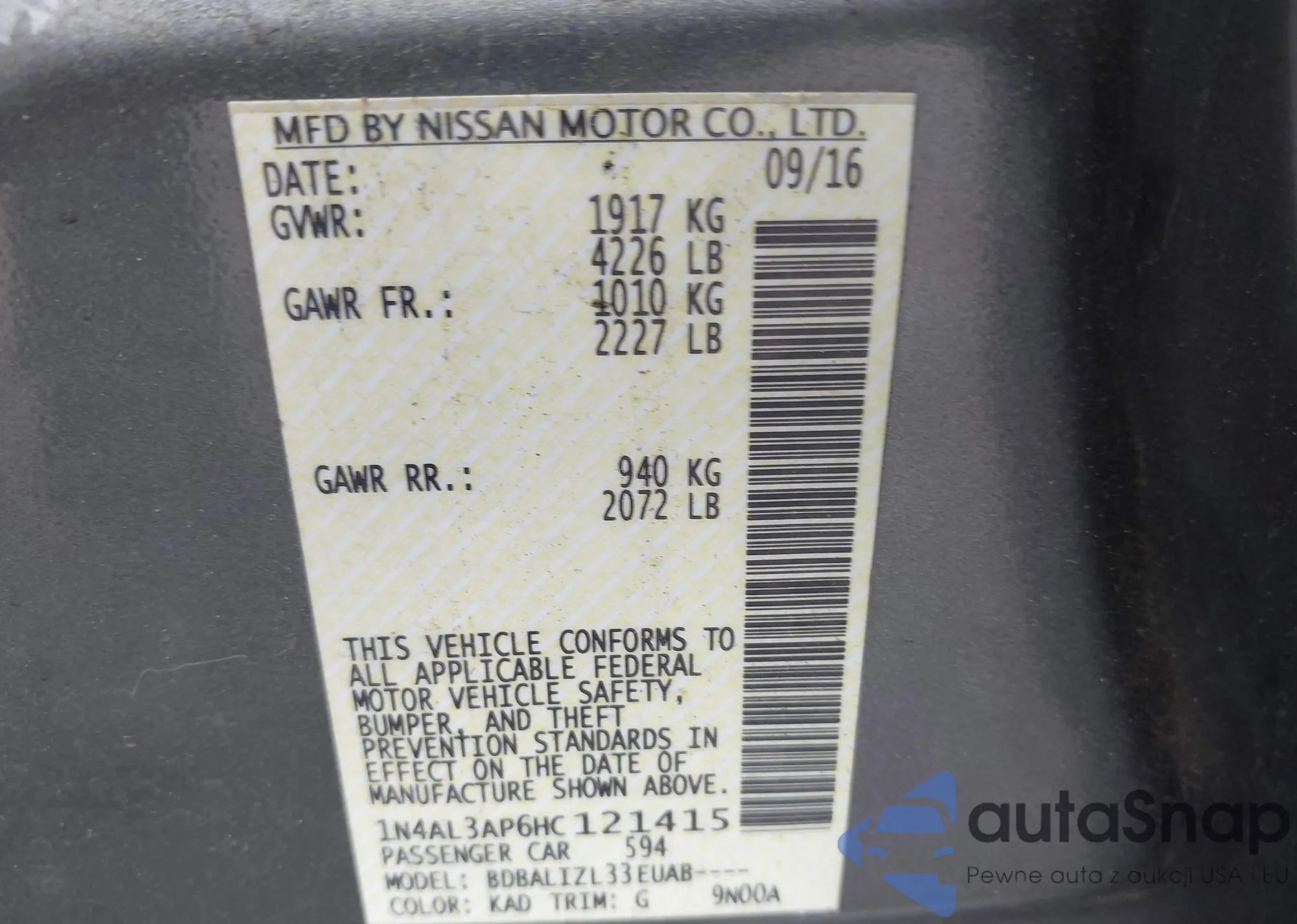 LOT: 42976913 VIN: 1N4AL3AP6HC121415