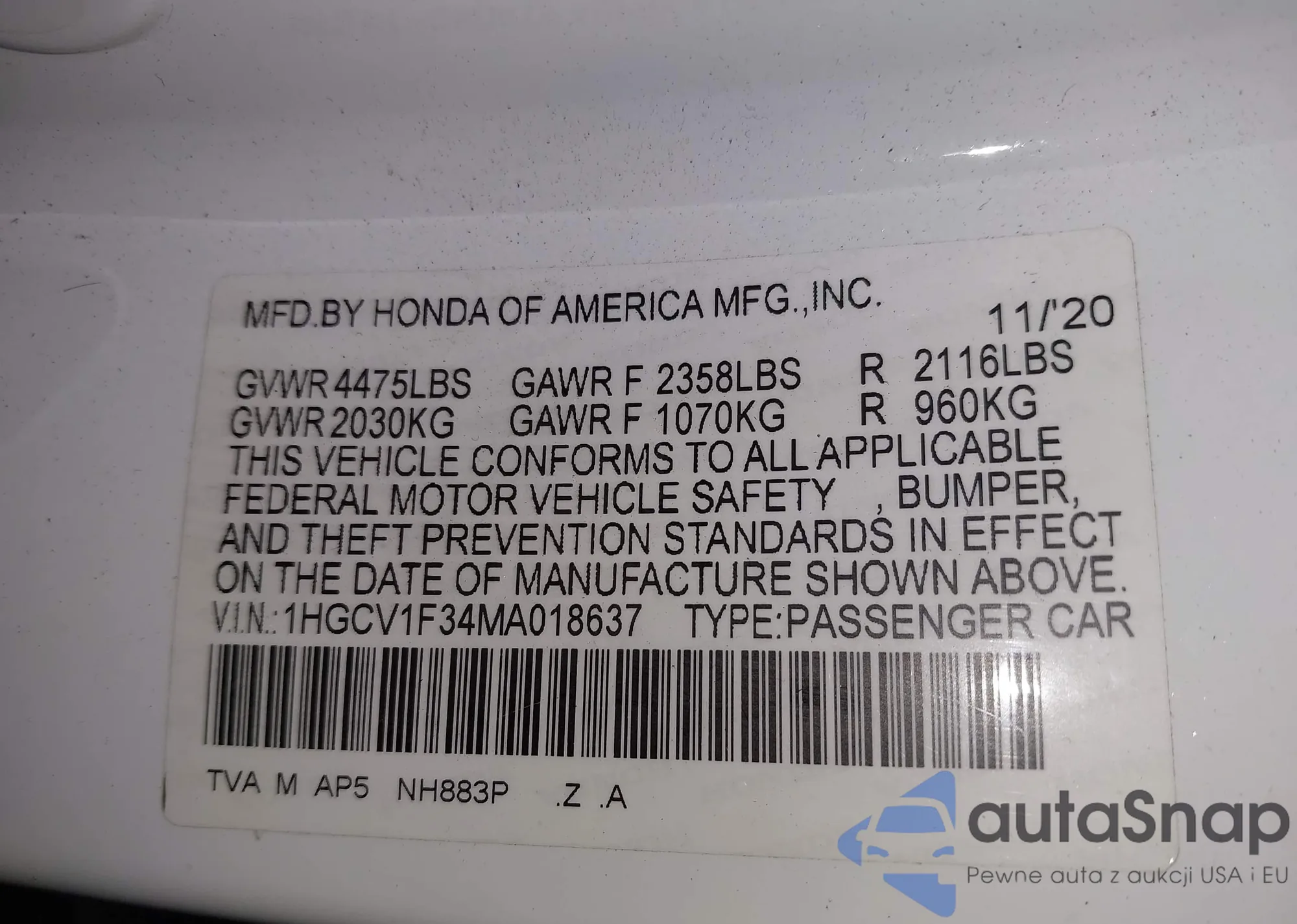 LOT: 42875430 VIN: 1HGCV1F34MA018637