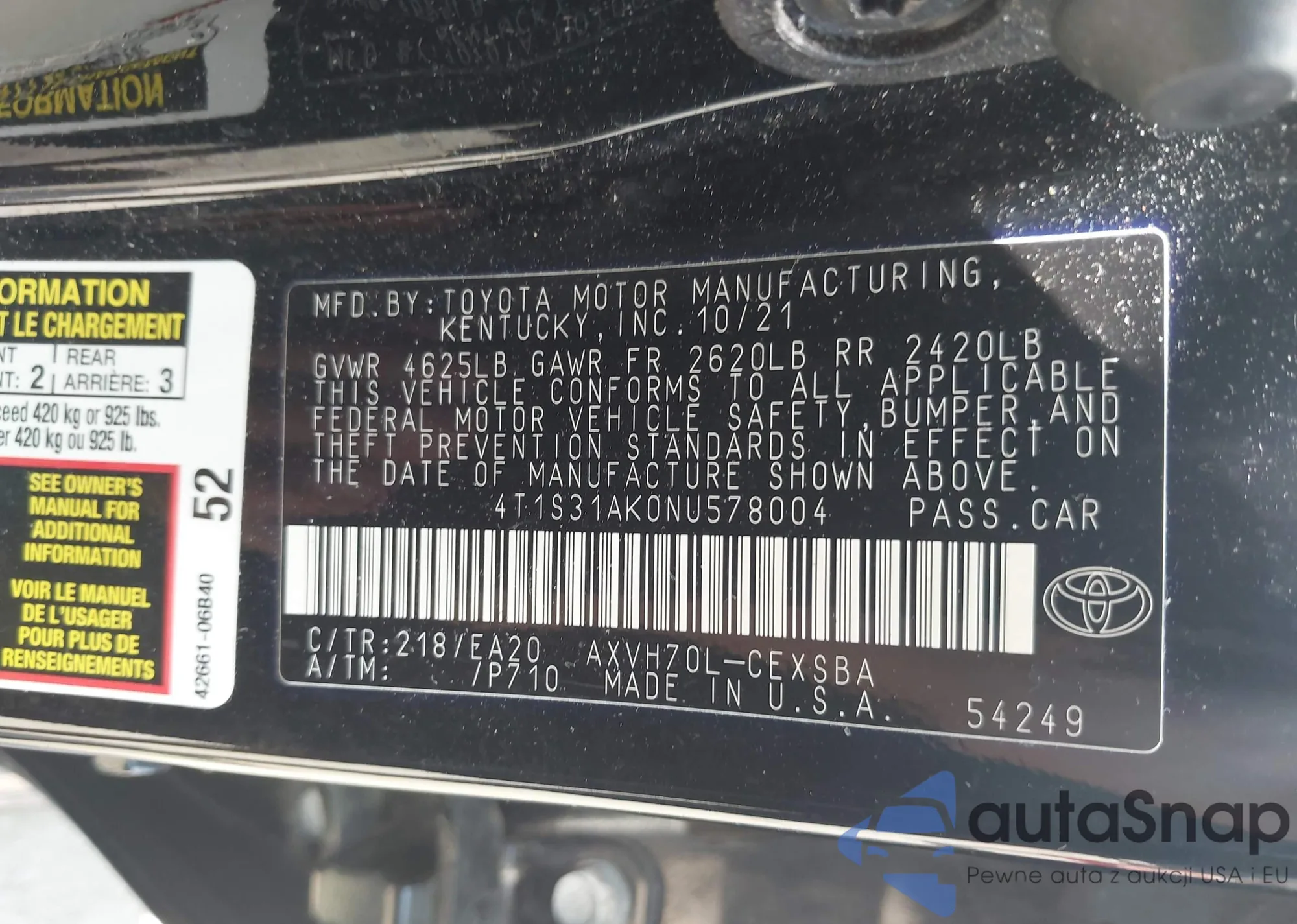 LOT: 42531619 VIN: 4T1S31AK0NU578004