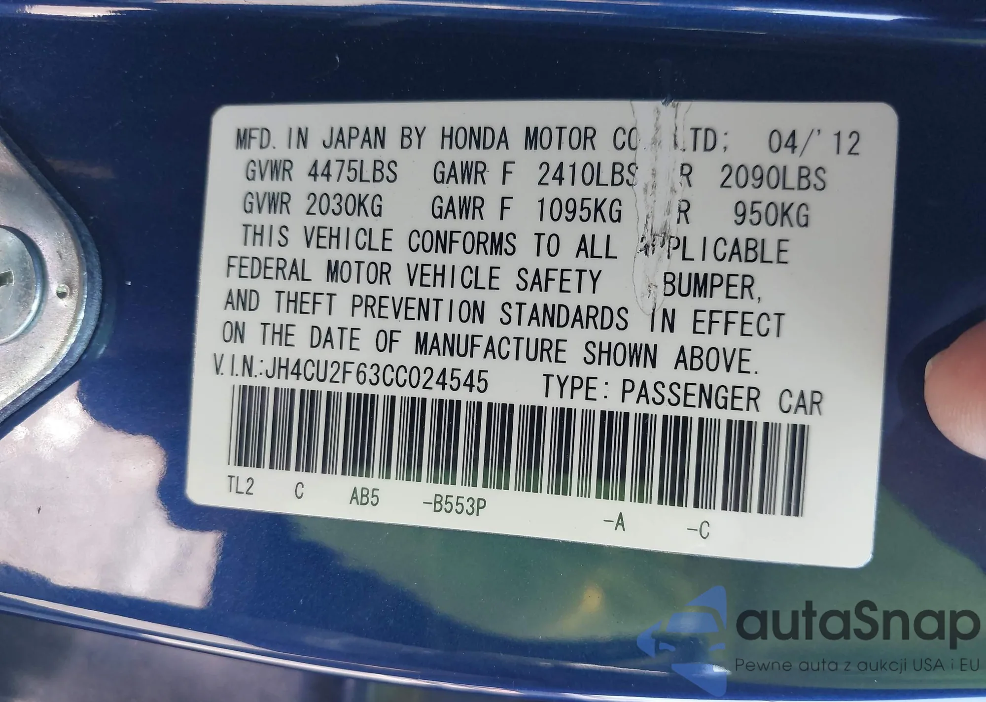 LOT: 43073403 VIN: 2HNYD28487H549164