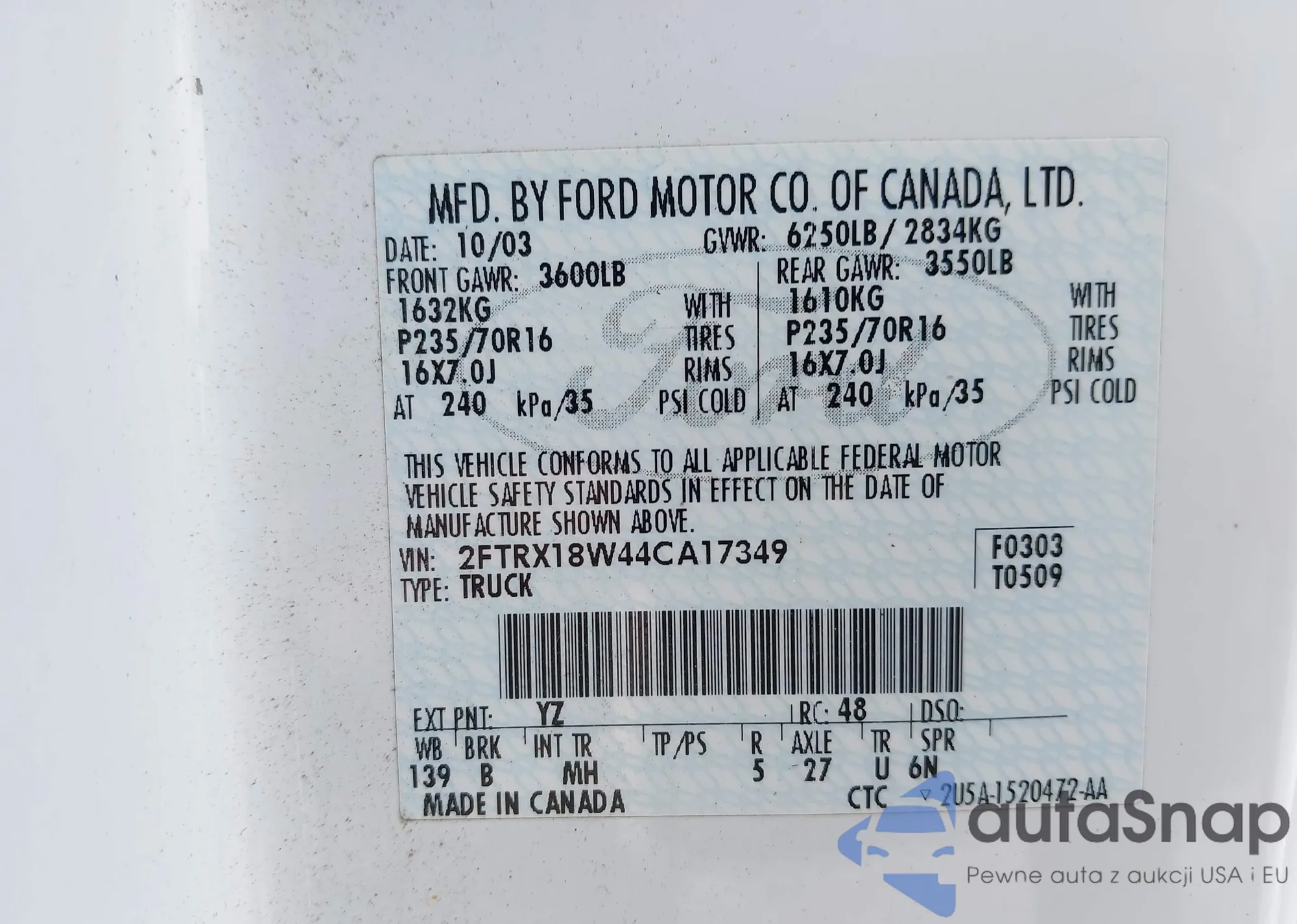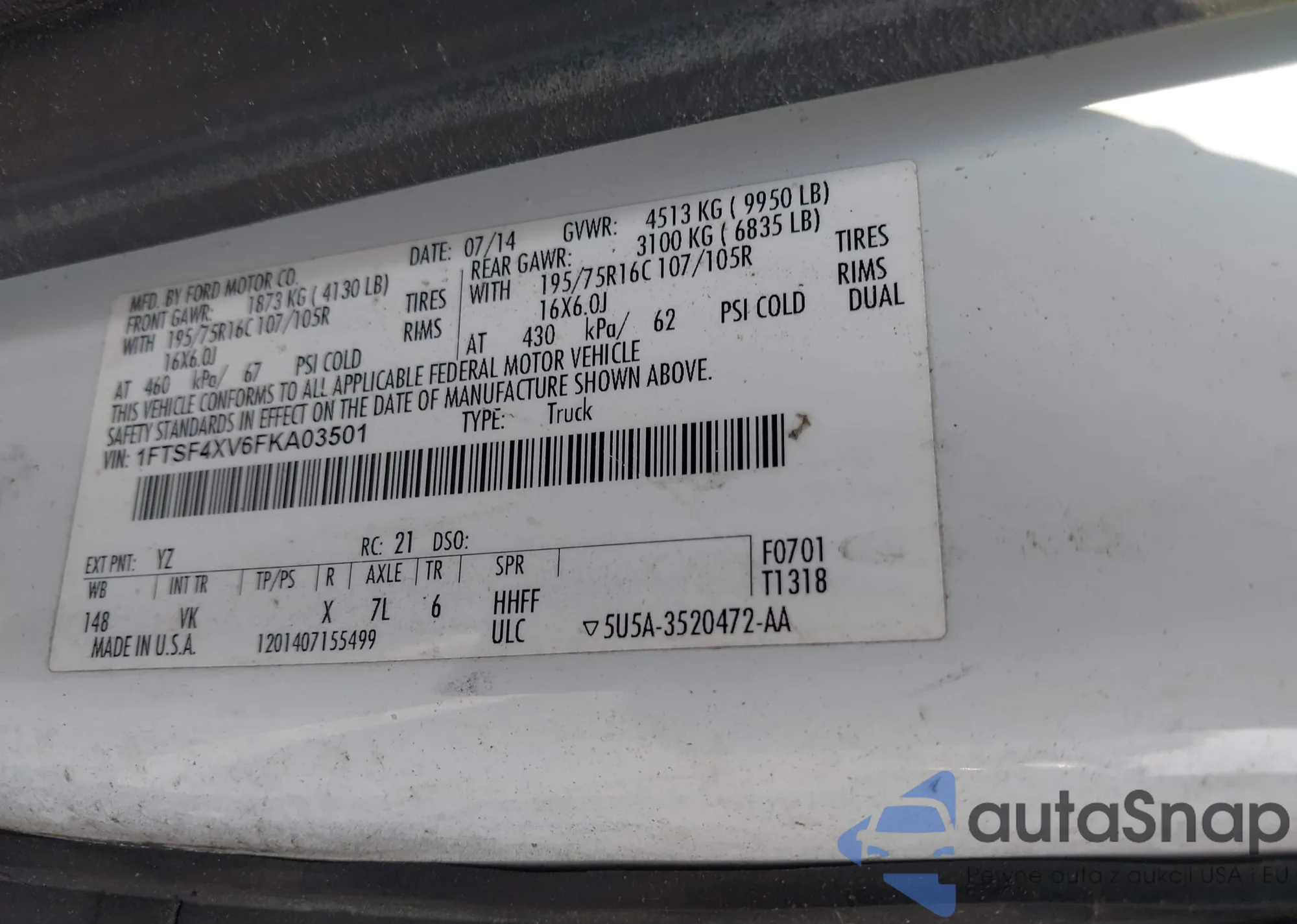 LOT: 43105442 VIN: 1FTSF4XV6FKA03501