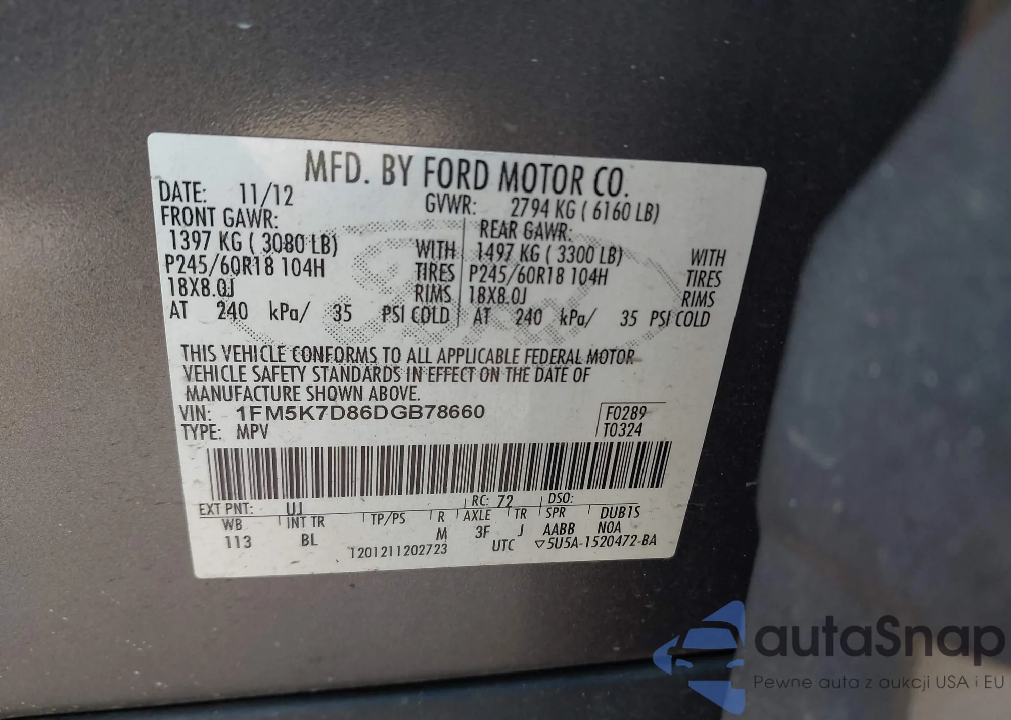 LOT: 43102139 VIN: 1FM5K7D86DGB78660