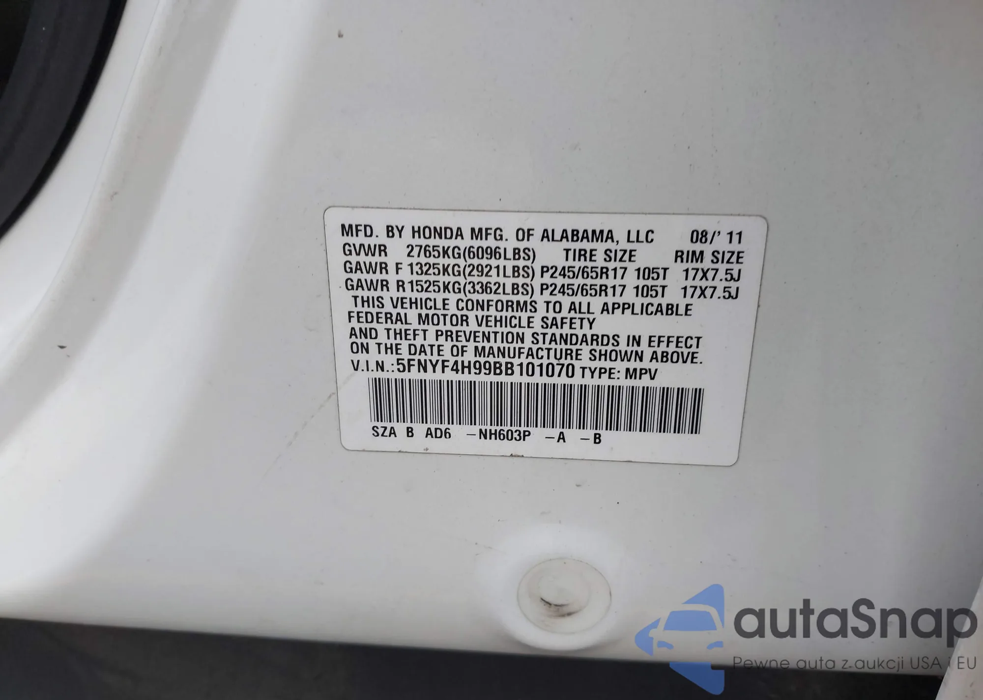 LOT: 43299840 VIN: 5FNYF4H99BB101070