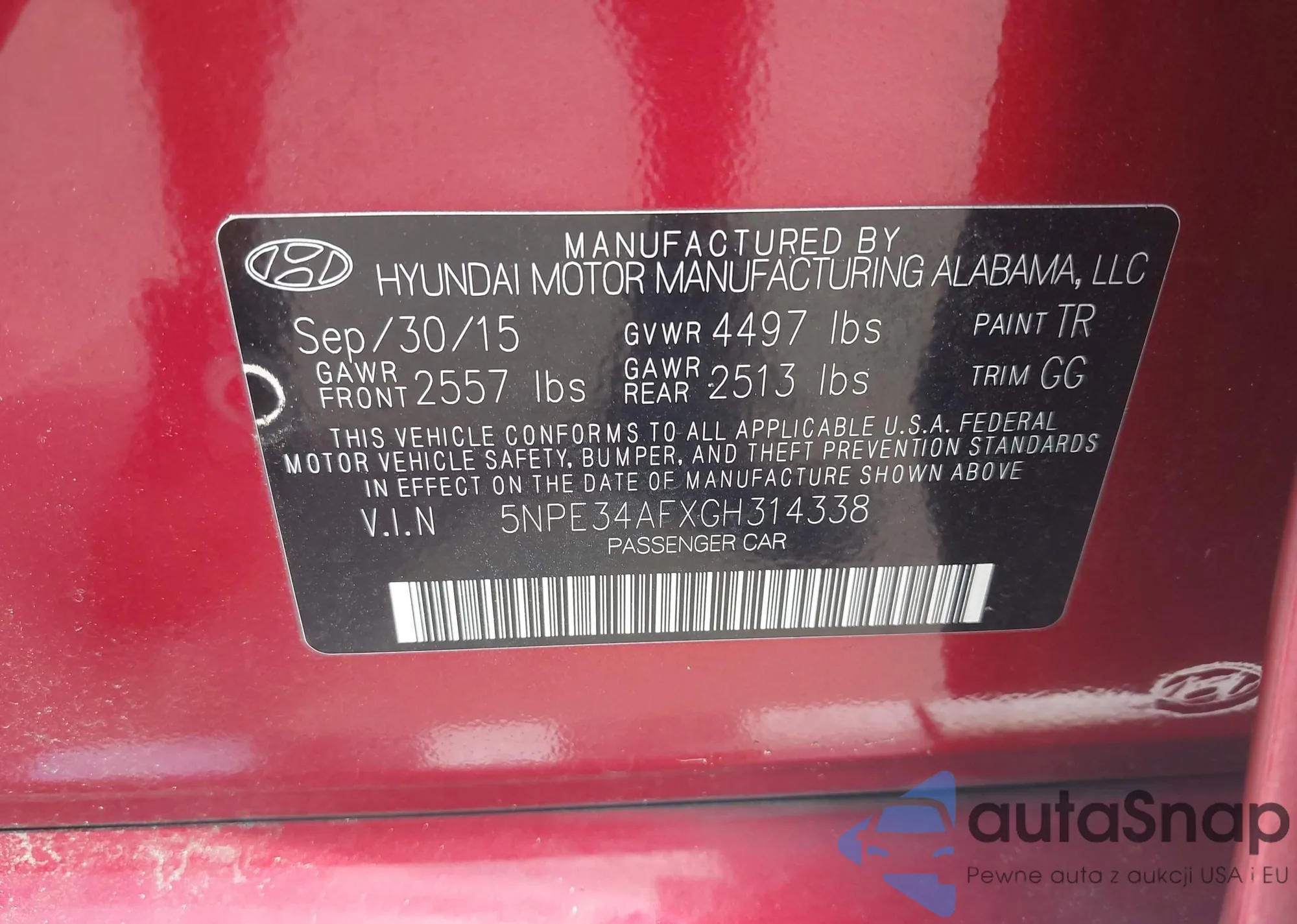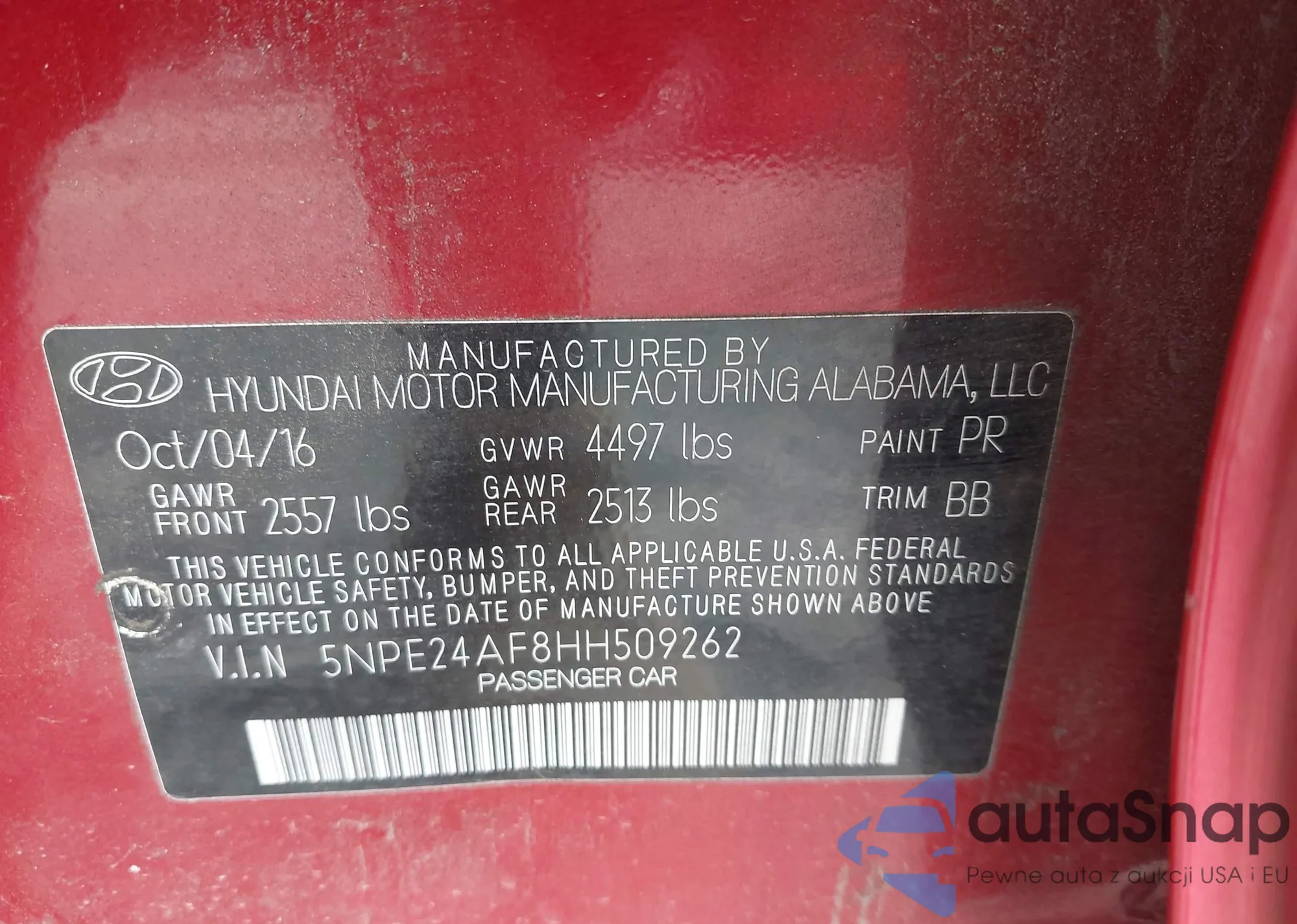 • VIN 5NPE24AF8HH509262