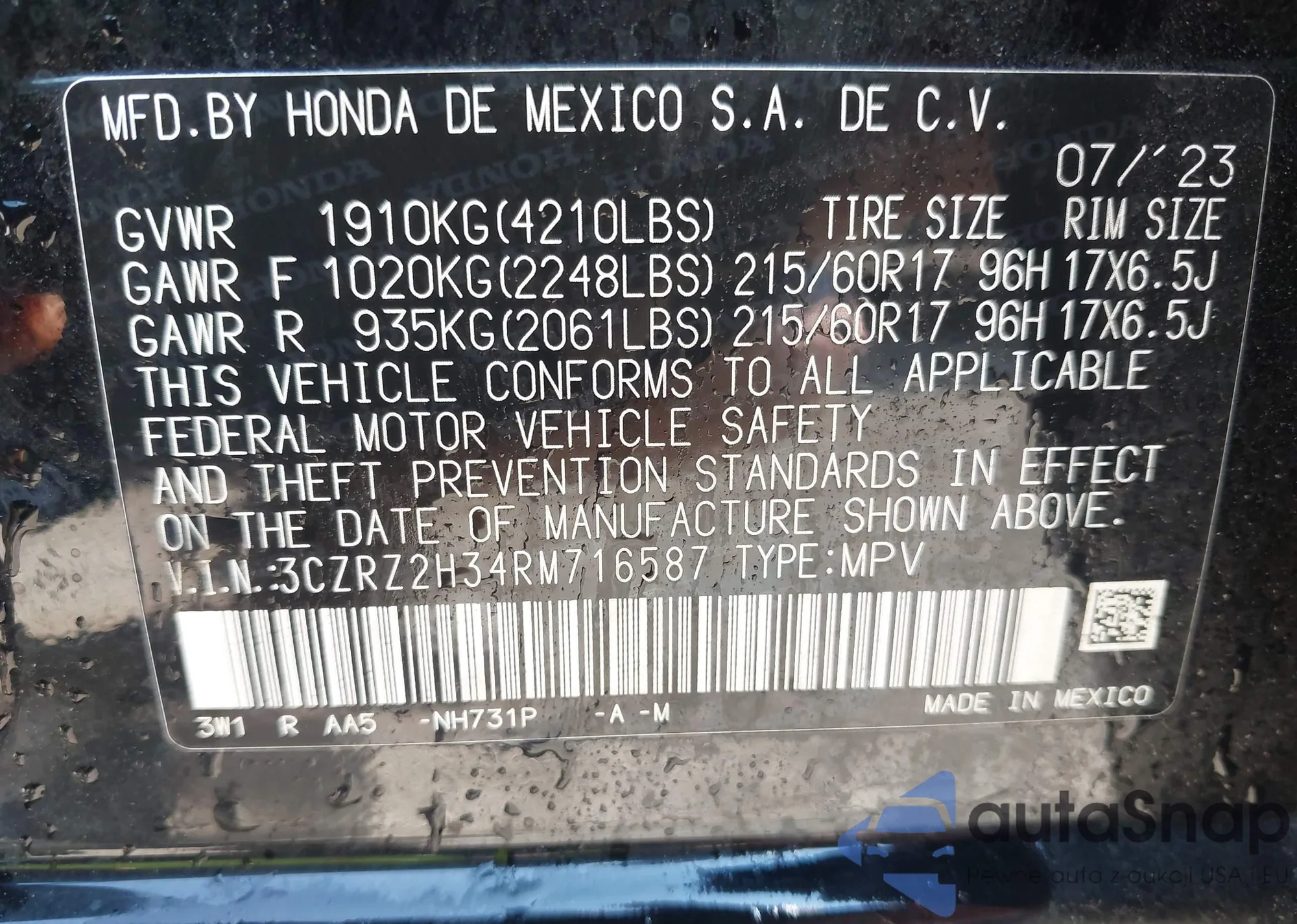 • VIN 3CZRZ2H34RM716587