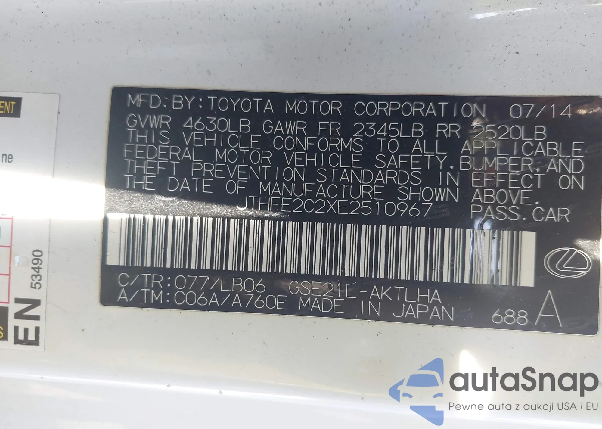 LOT: 43251625 VIN: JTHFE2C2XE2510967