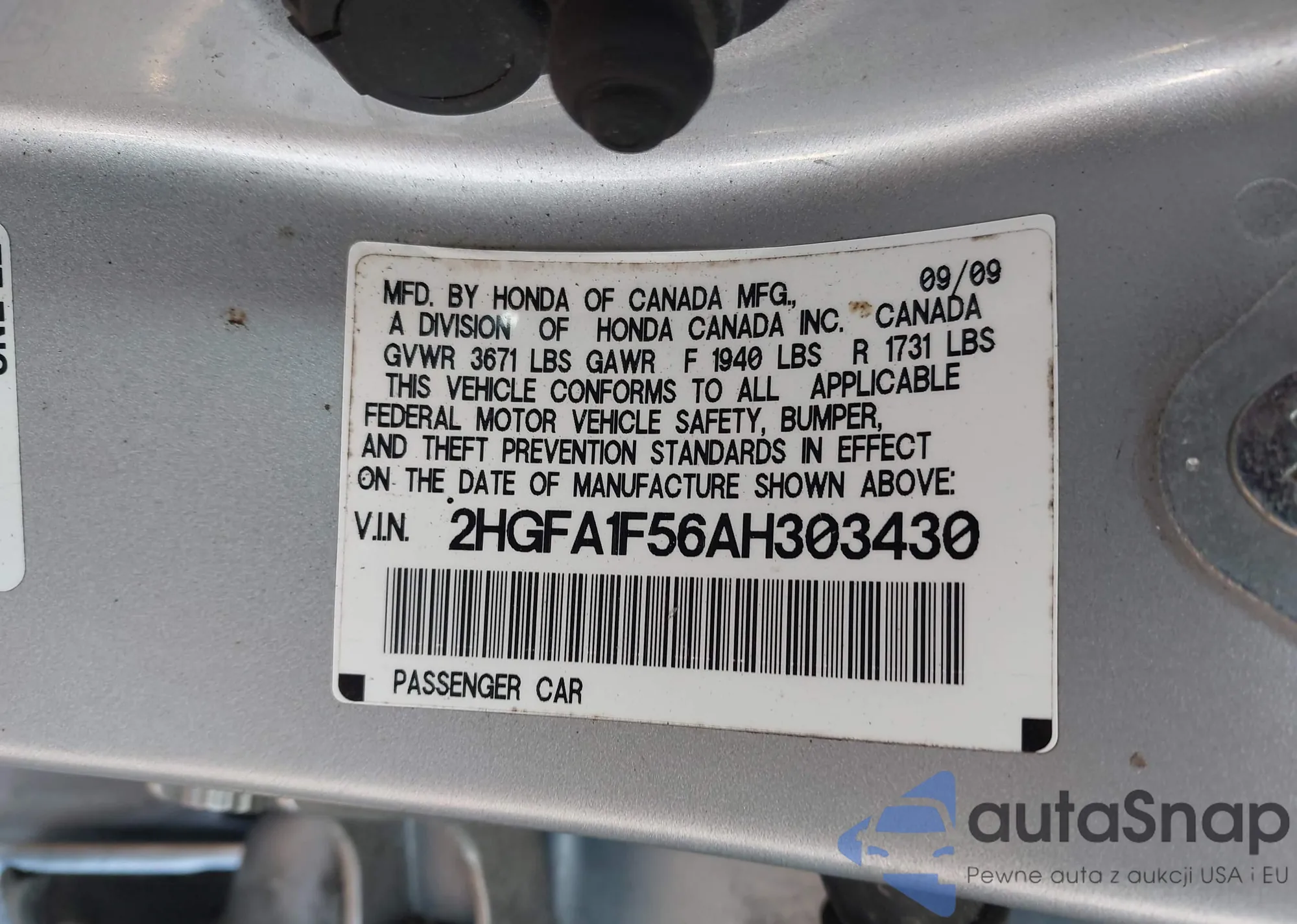 LOT: 43257212 VIN: 2HGFA1F56AH303430