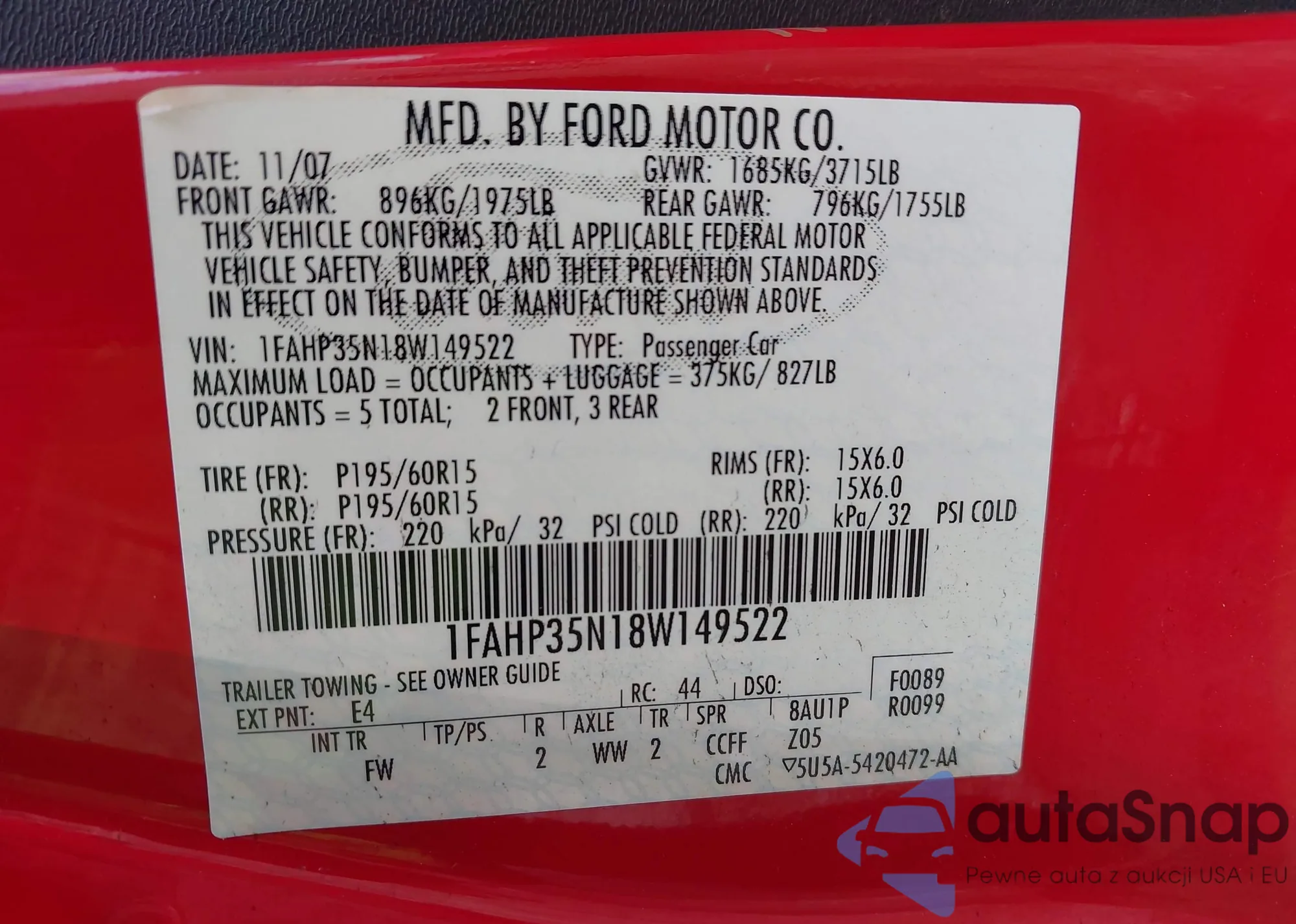 • VIN 1FAHP35N18W149522