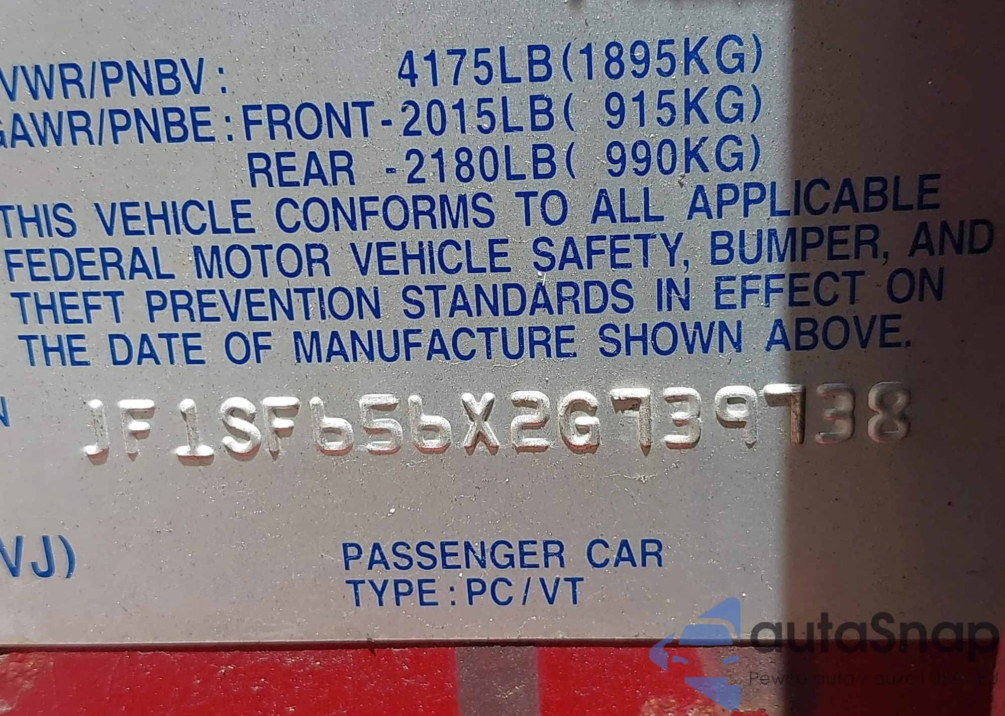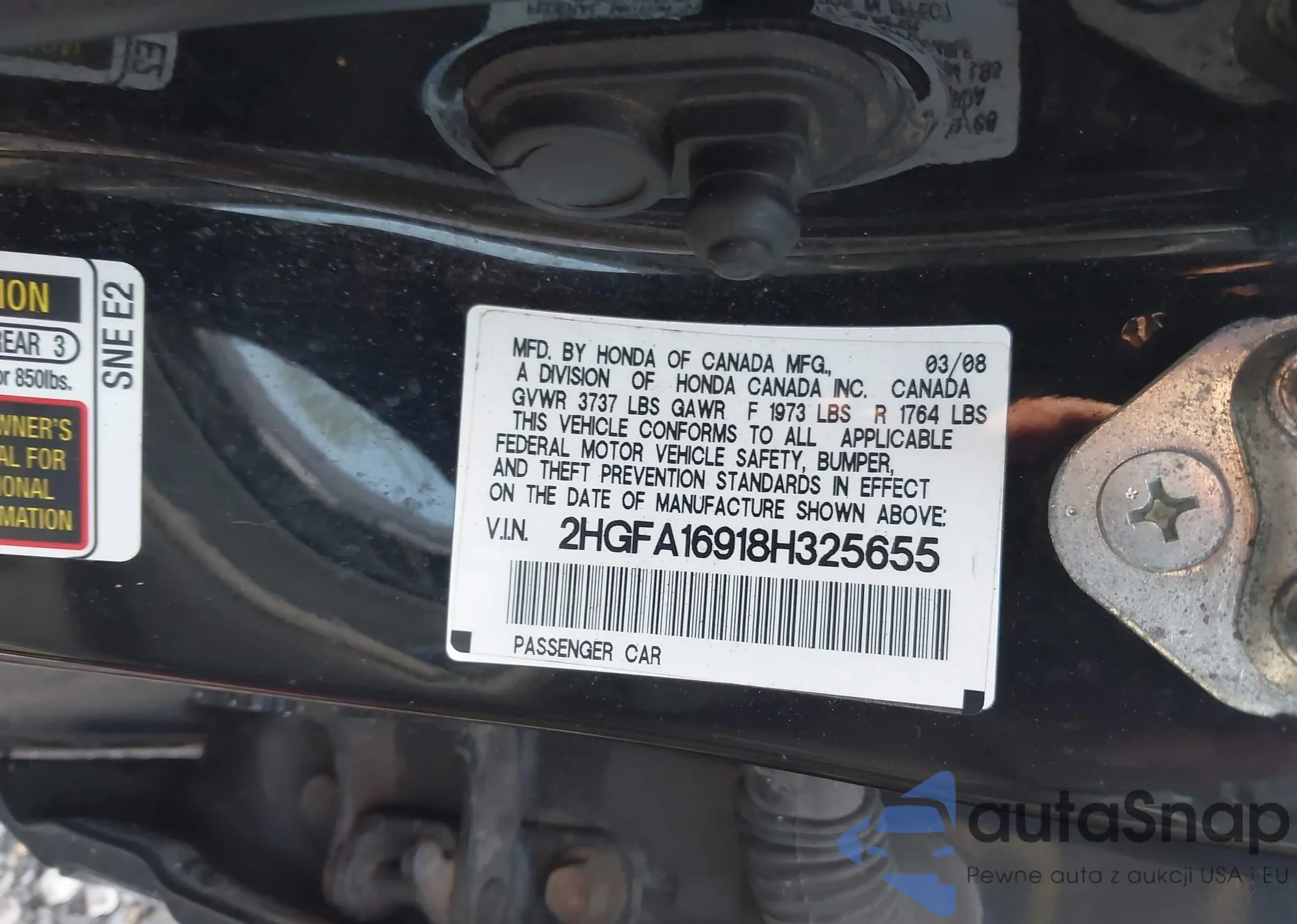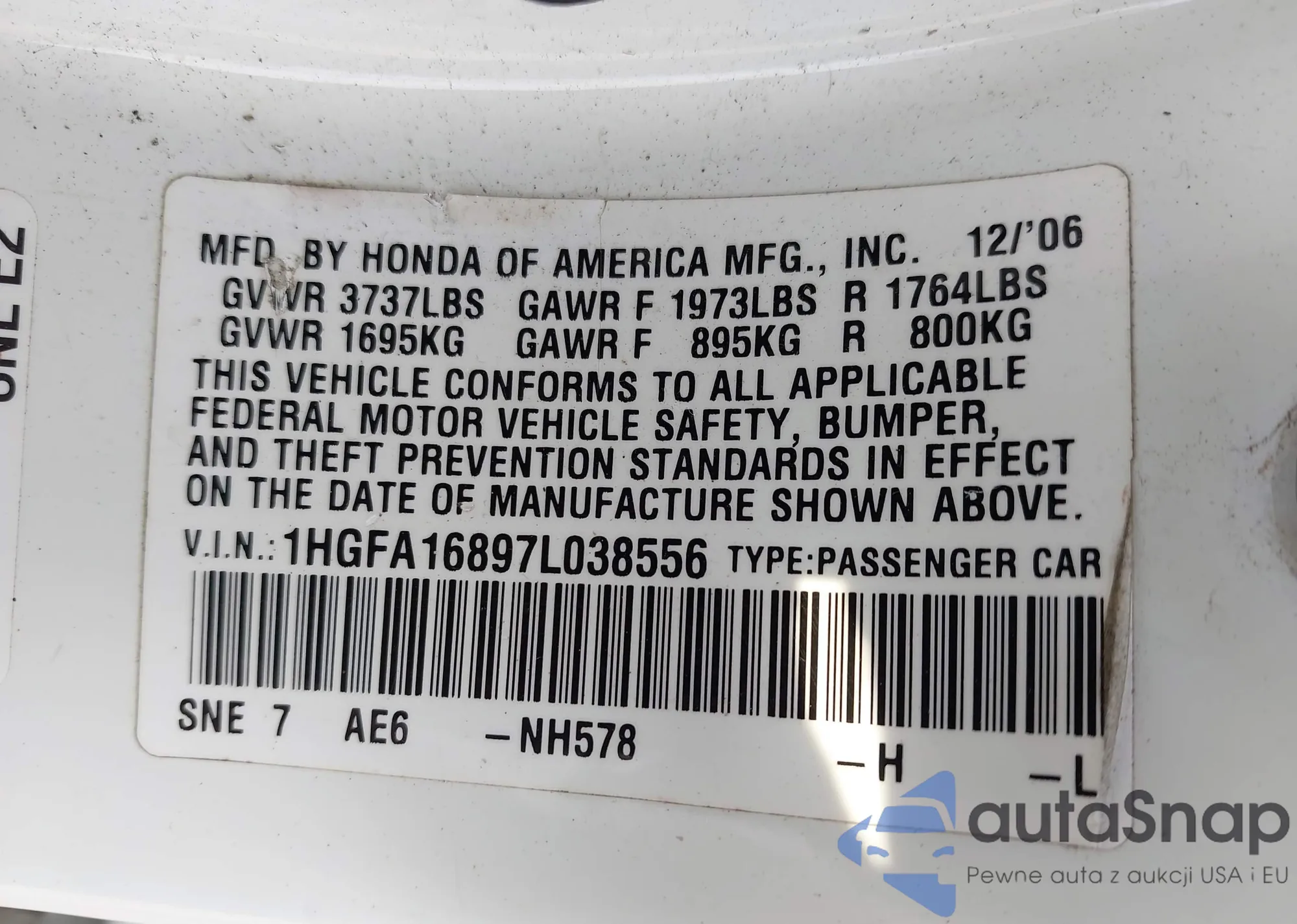 LOT: 42894086 VIN: 1HGFA16897L038556