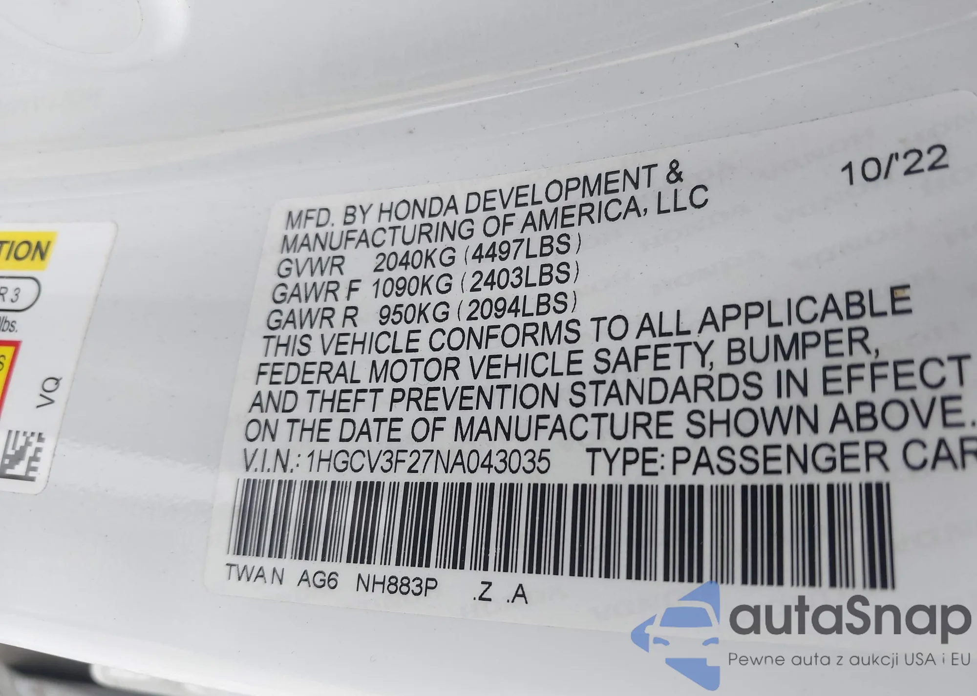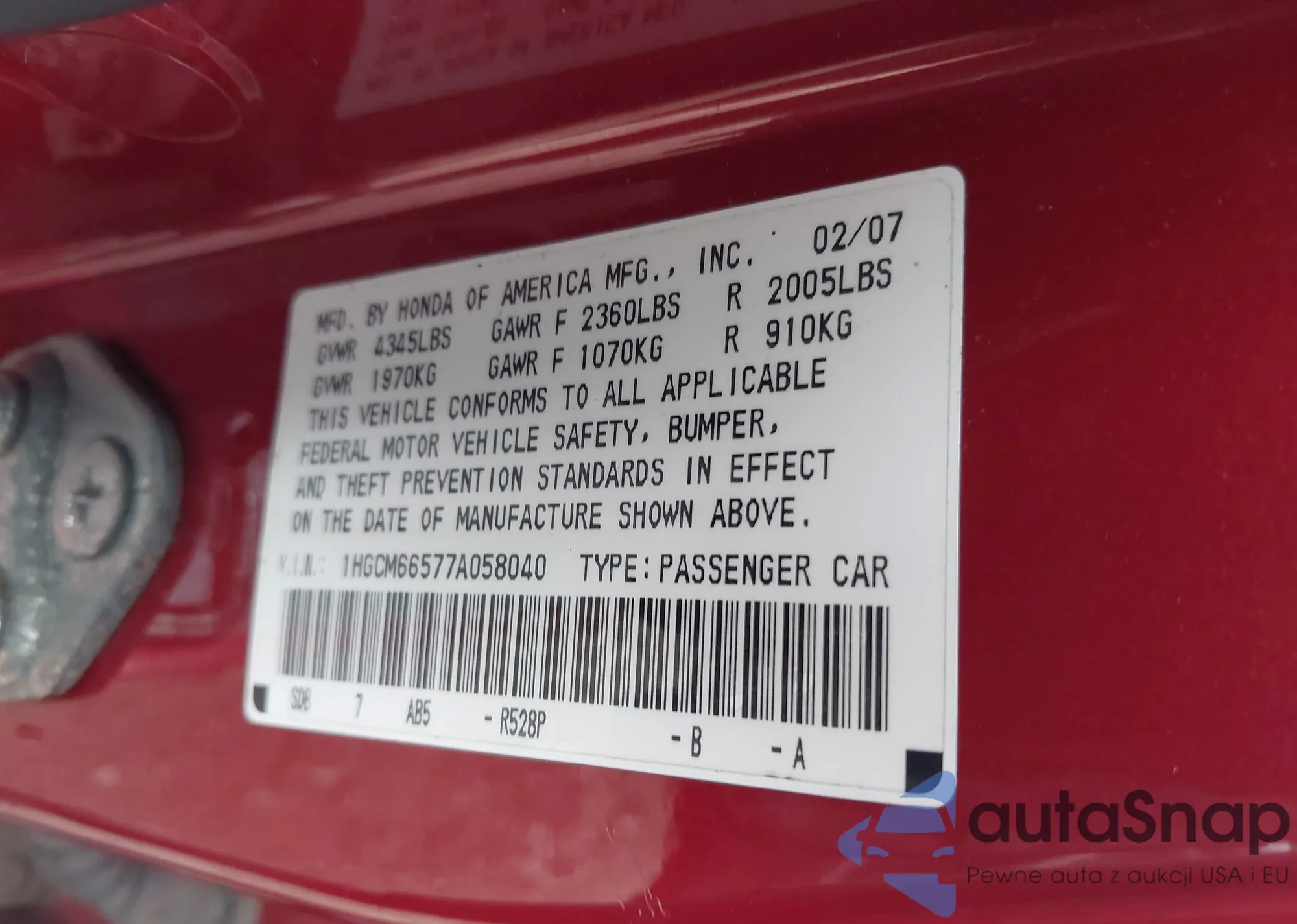 LOT: 43111478 VIN: 1HGCM66577A058040