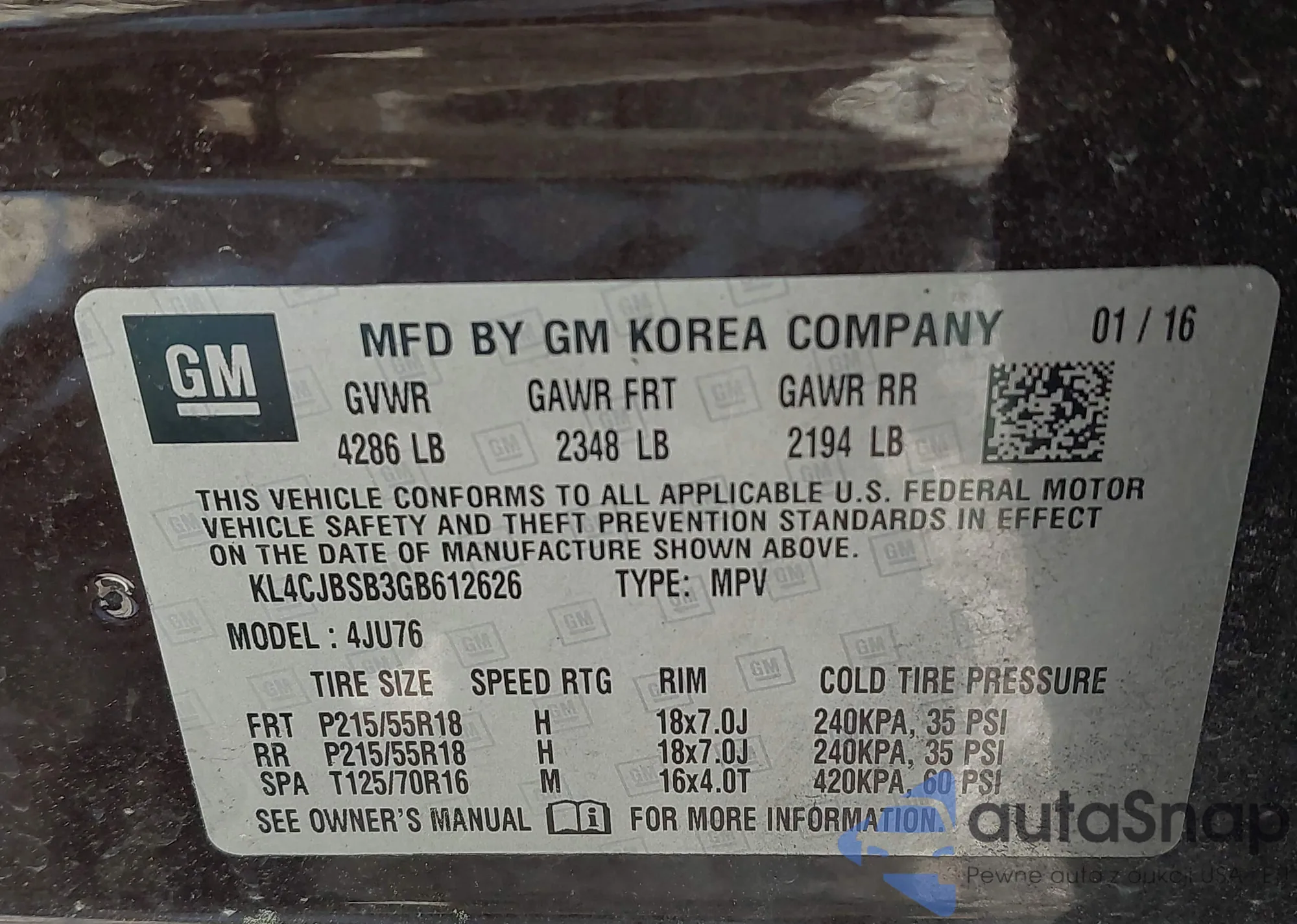 • VIN KL4CJBSB3GB612626