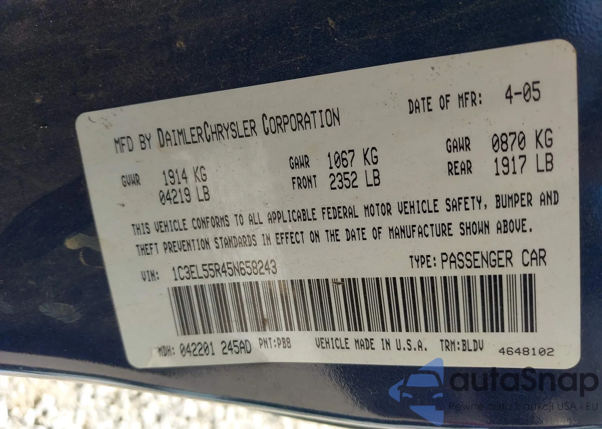 LOT: 43250432 VIN: 1C3EL55R45N658243