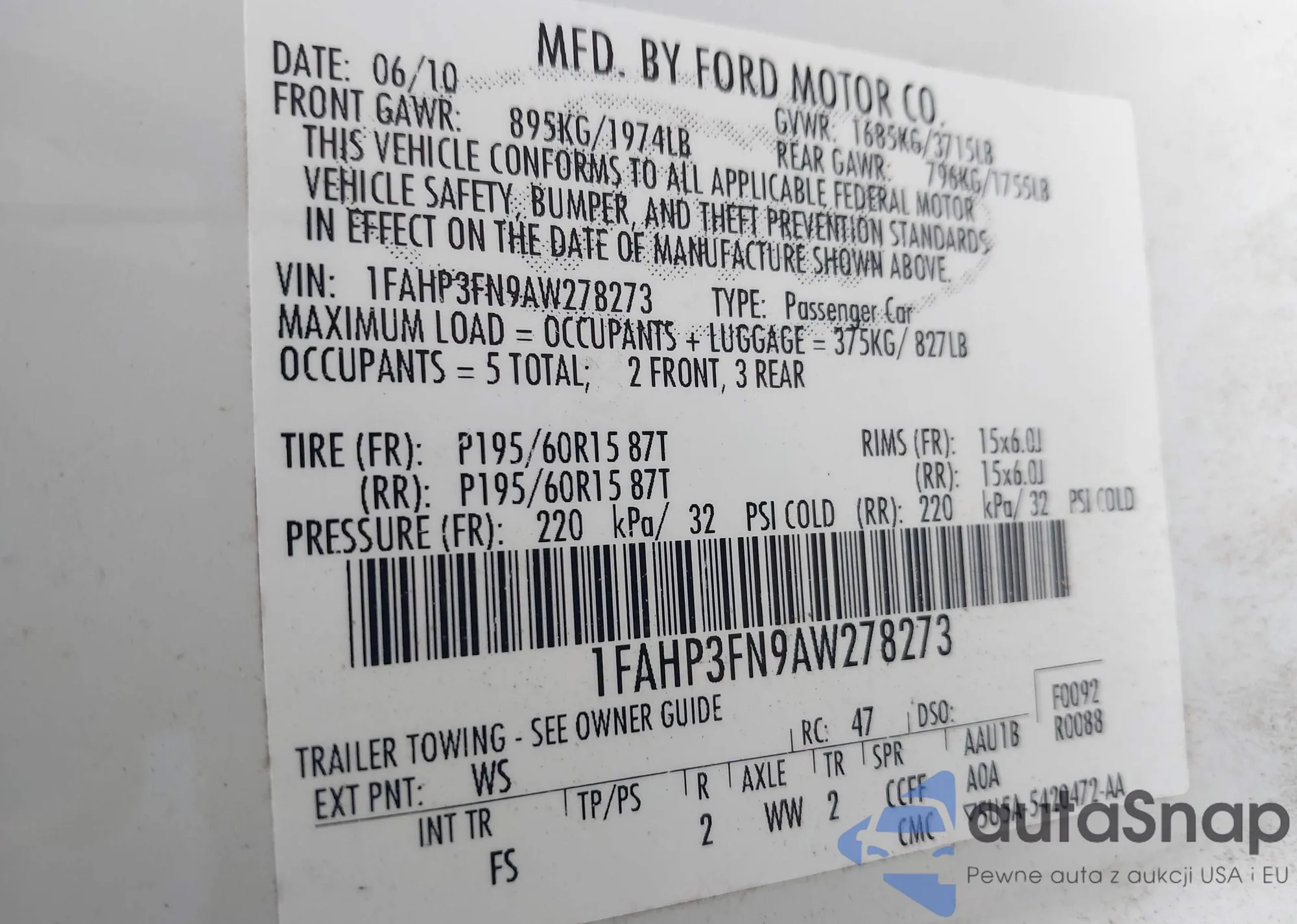 • VIN 1FAHP3FN9AW278273