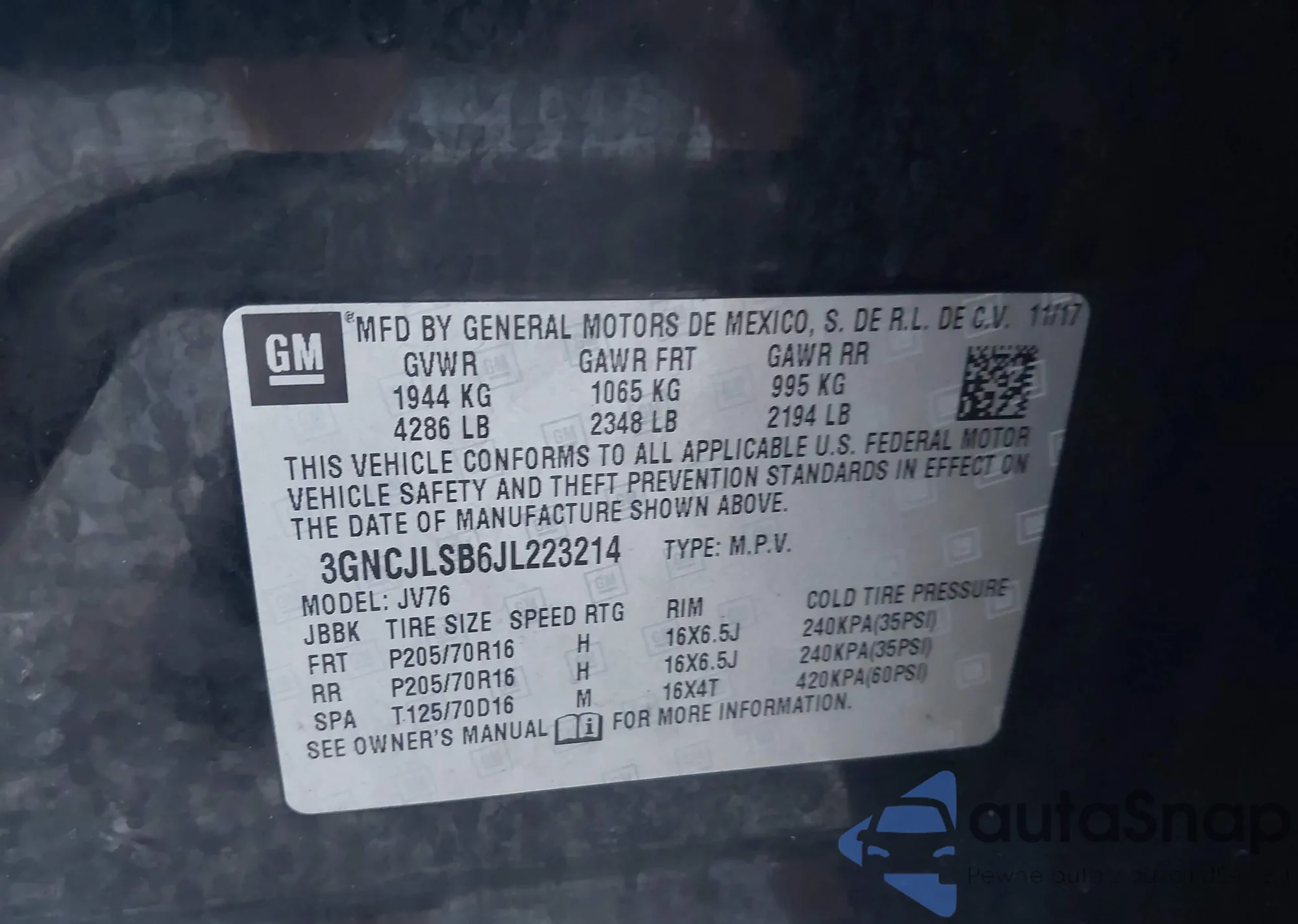• VIN 3GNCJLSB6JL223214
