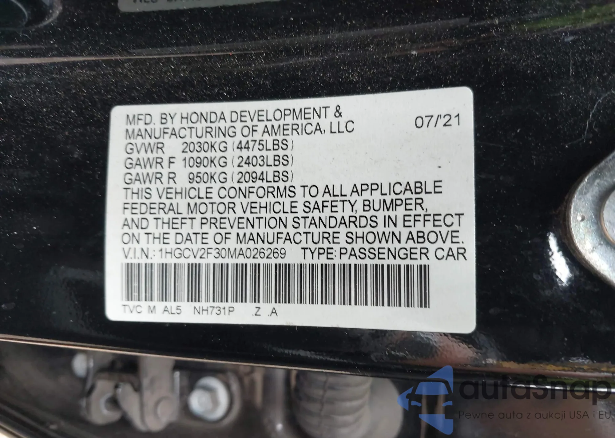 LOT: 42612879 VIN: 1HGCV2F30MA026269