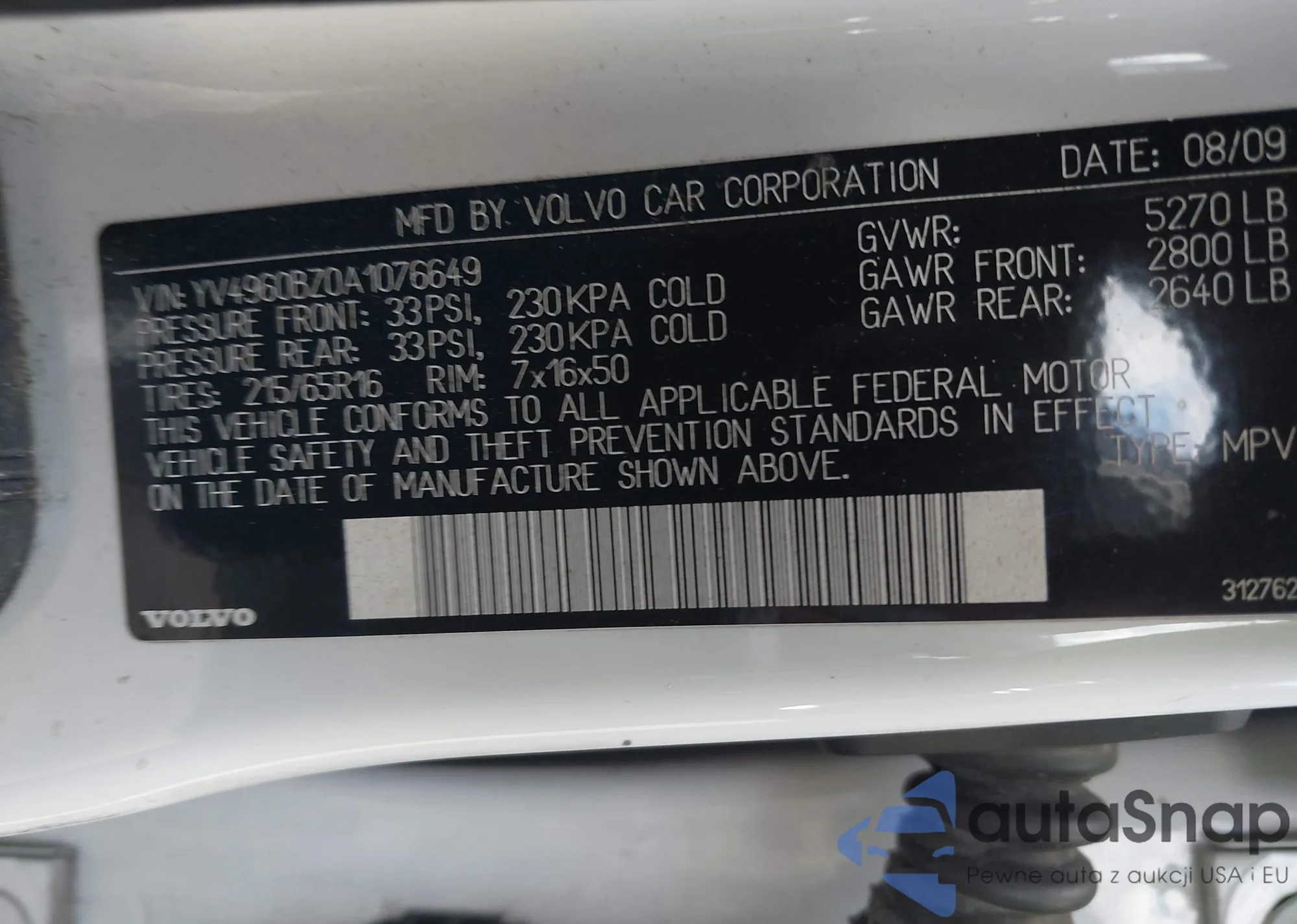 LOT: 43075938 VIN: YV4960BZ0A1076649