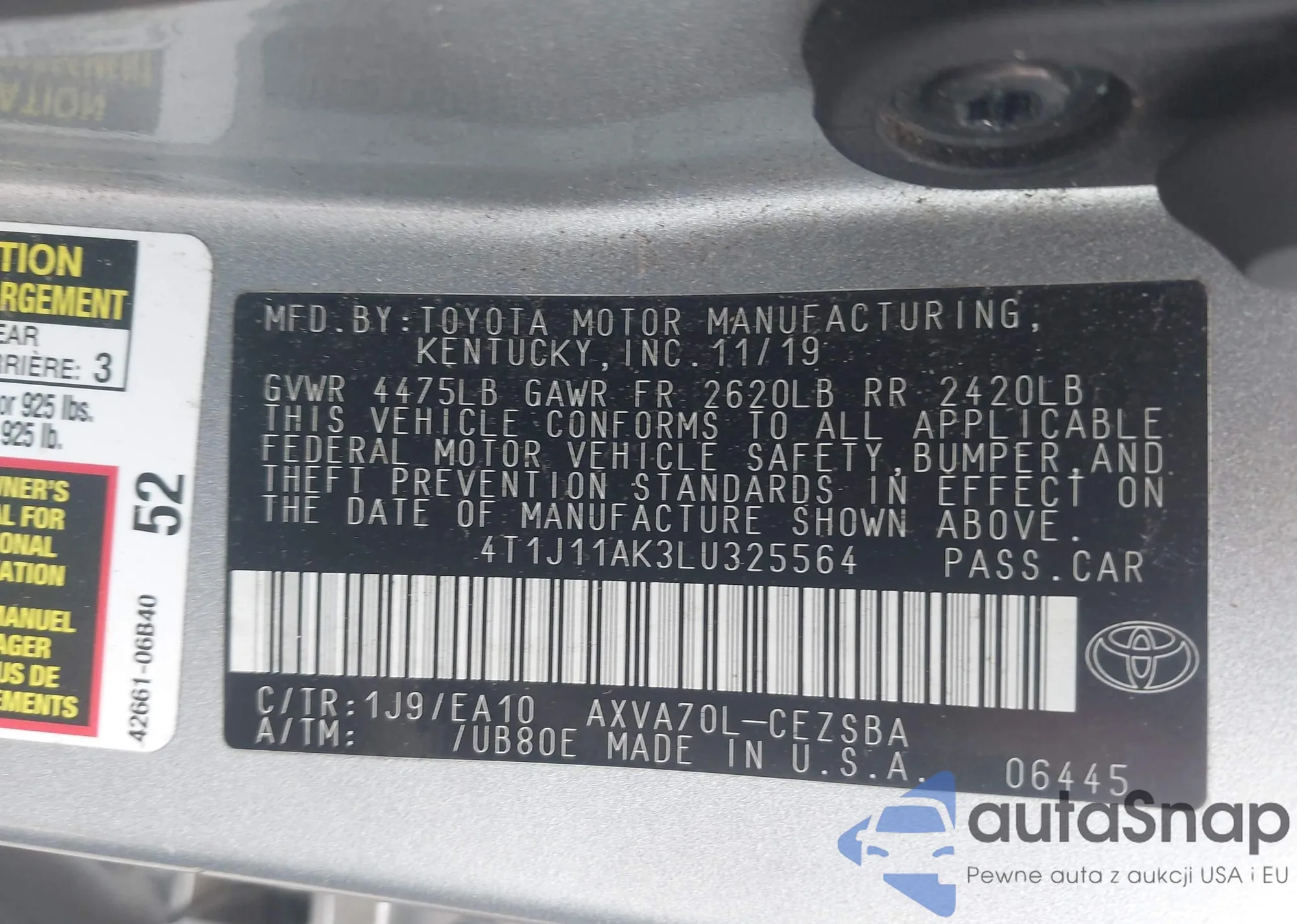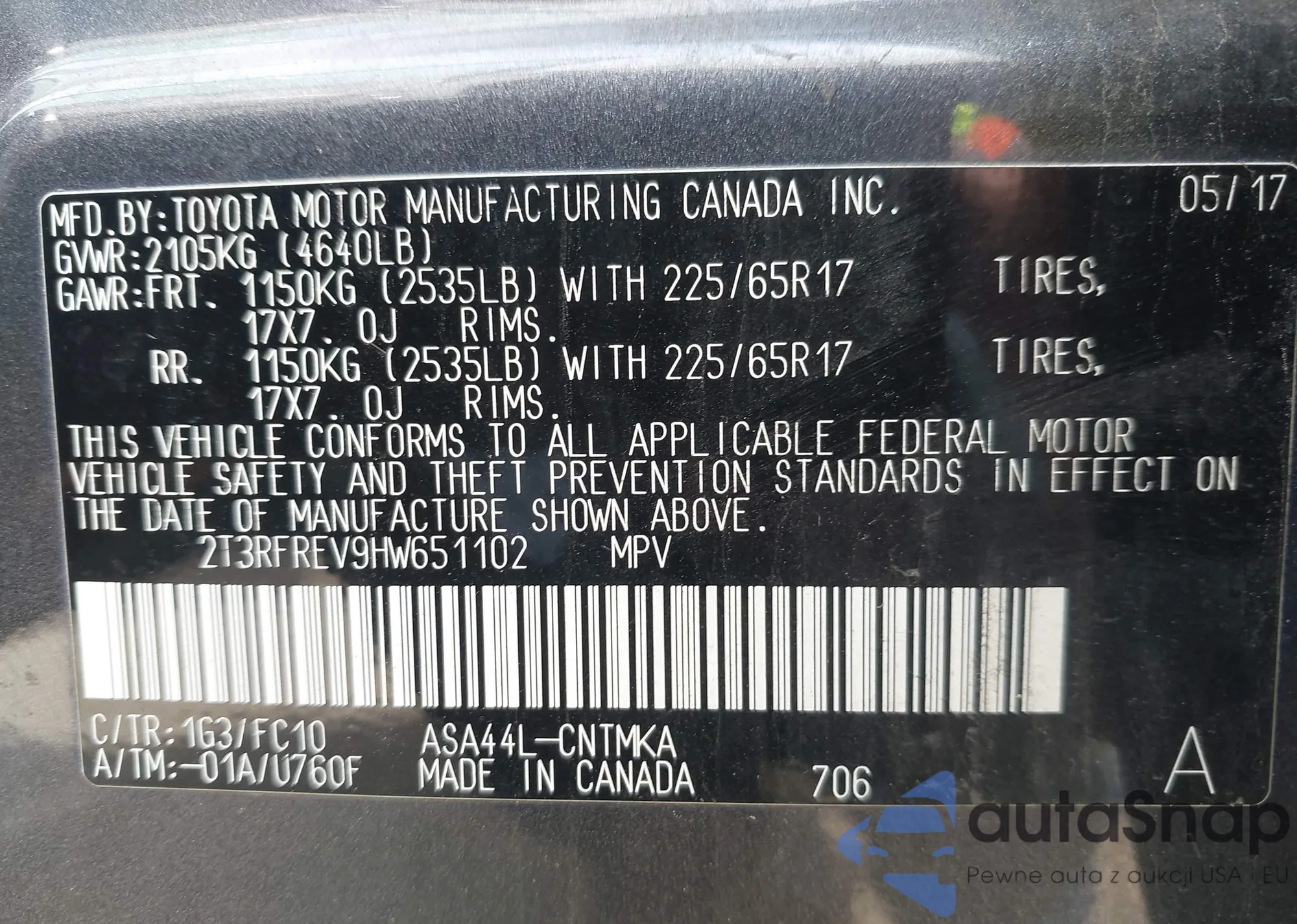 LOT: 43168395 VIN: 2T3RFREV9HW651102